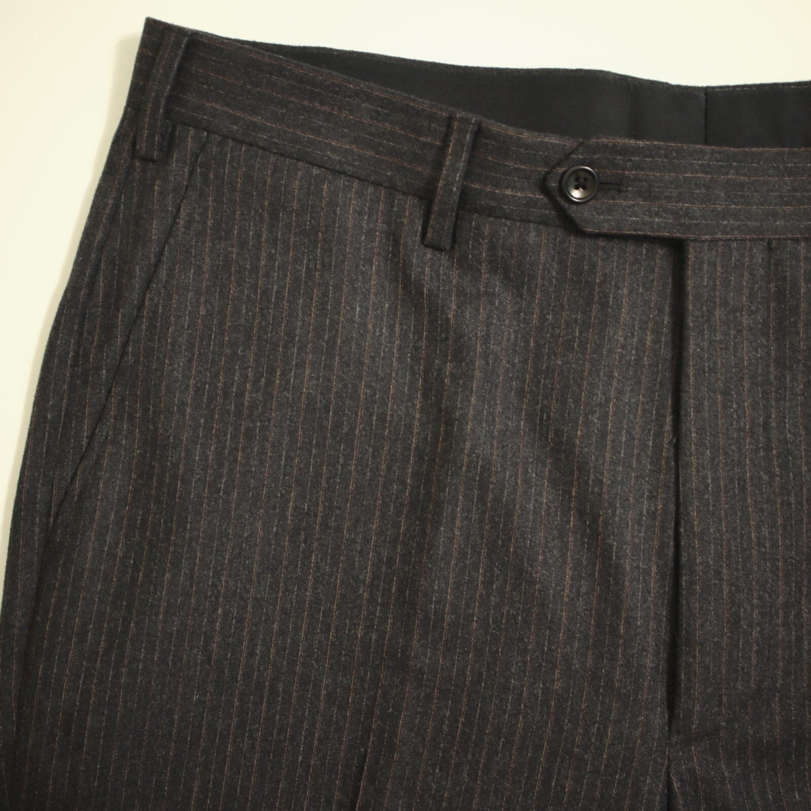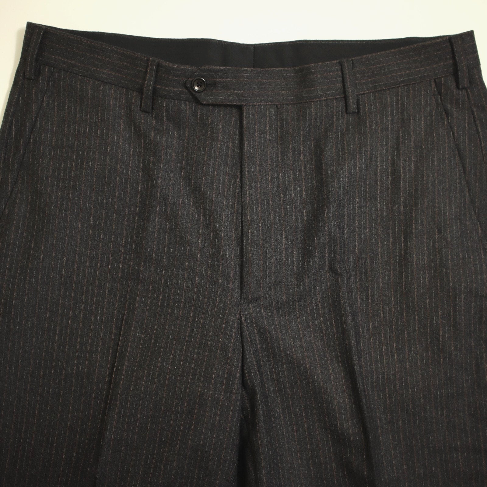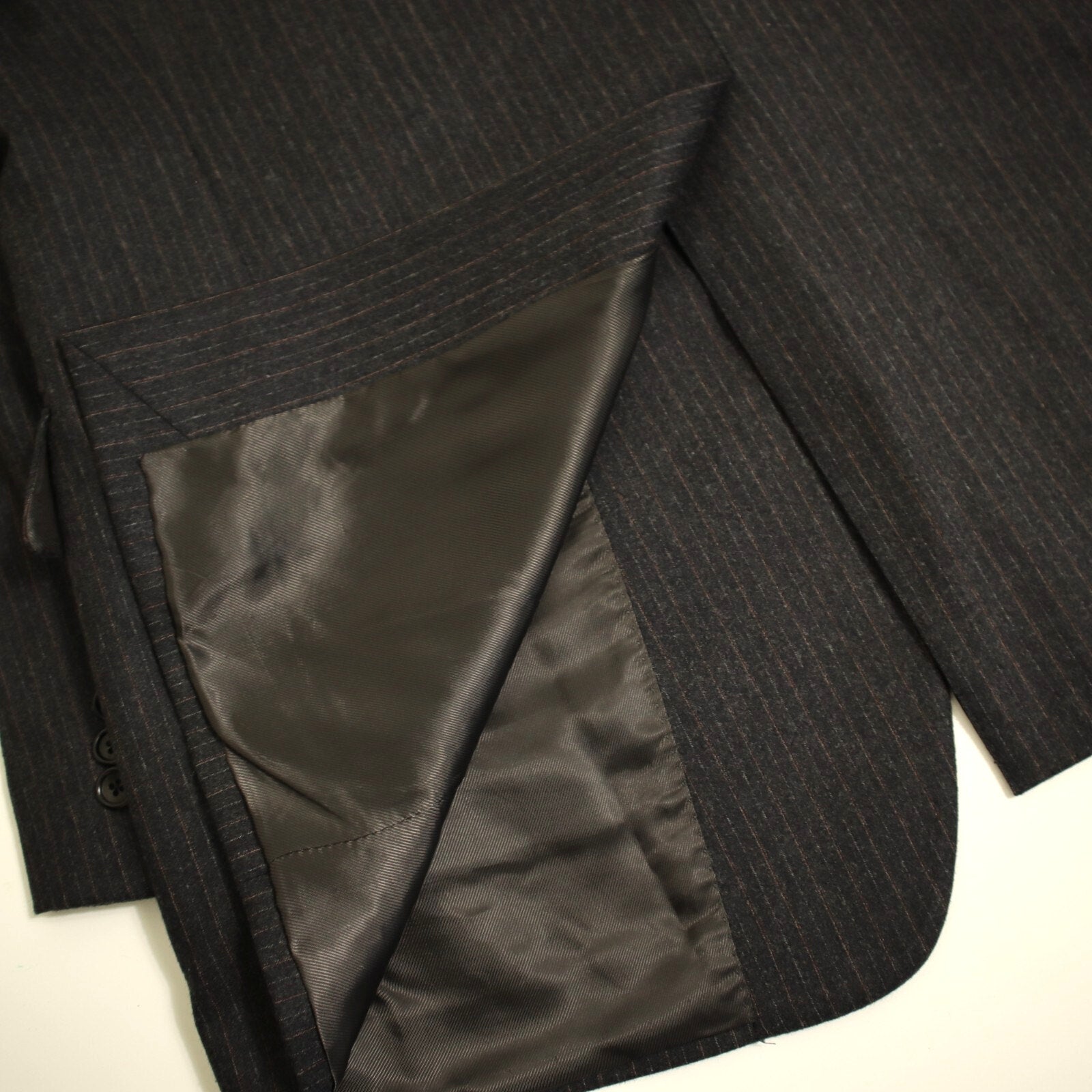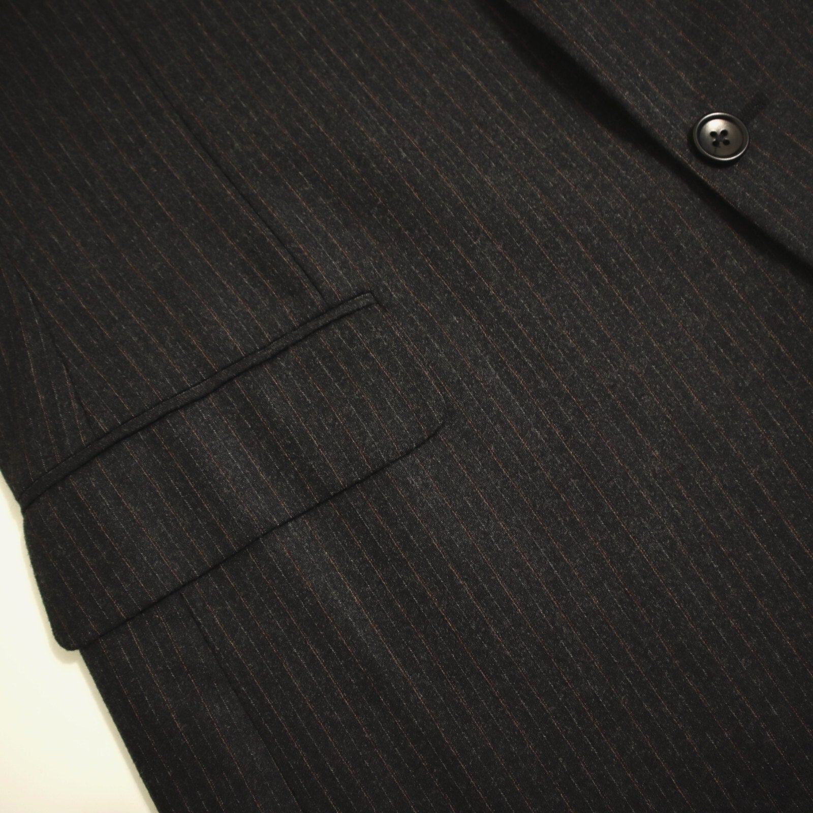This suit is crafted with a classic 2 button, single-breasted design, featuring a single vented back for enhanced movement and fit. The jacket is equipped with flap pockets and 4 cuff buttons on each sleeve. The rich fabric is woven in a rich charcoal pinstripe and is composed of a flannel weight Italian wool, ensuring both luxury and comfort. The interior is fully lined and canvased. Because of the nature of pre owned clothes, measurements can change over time. Please note measurements.