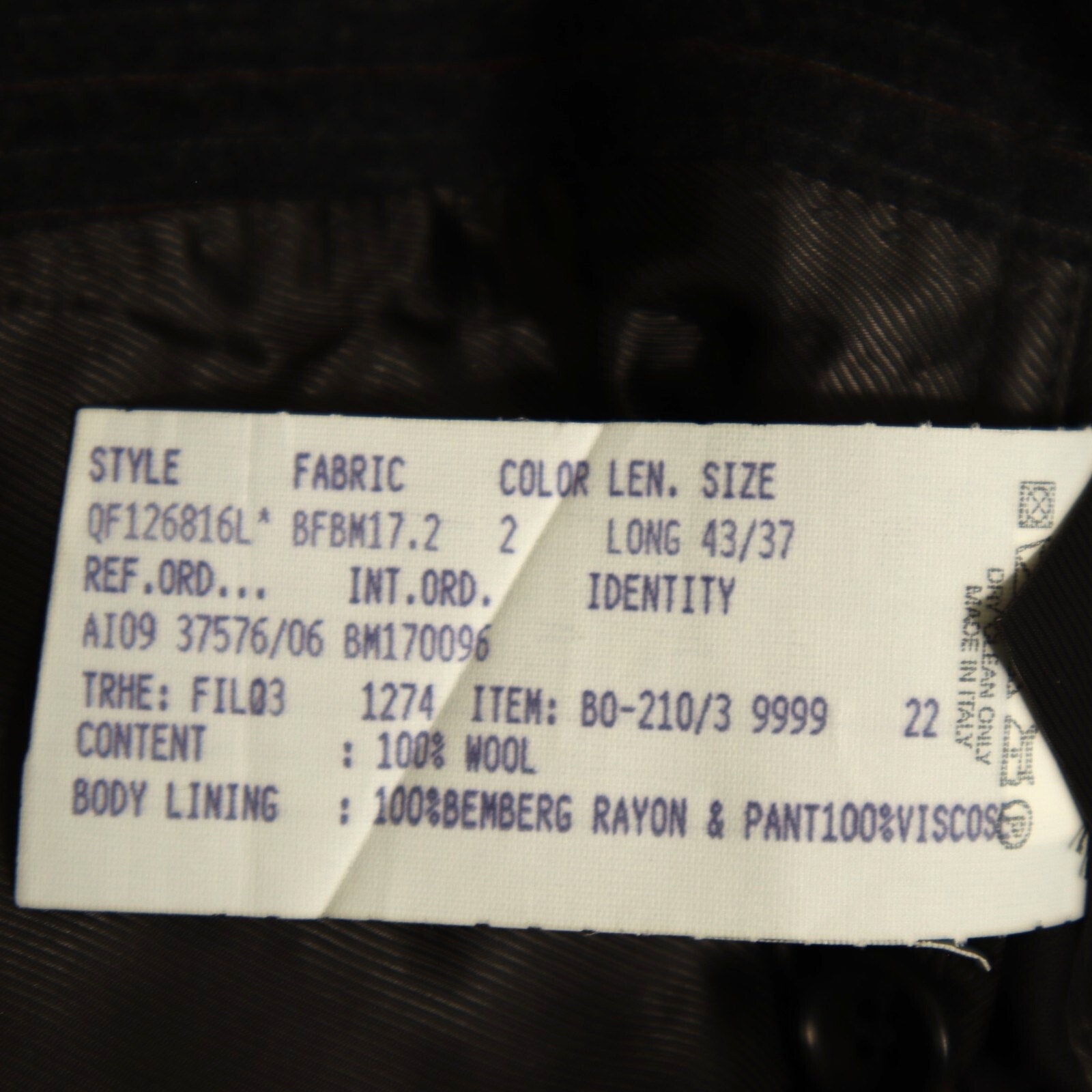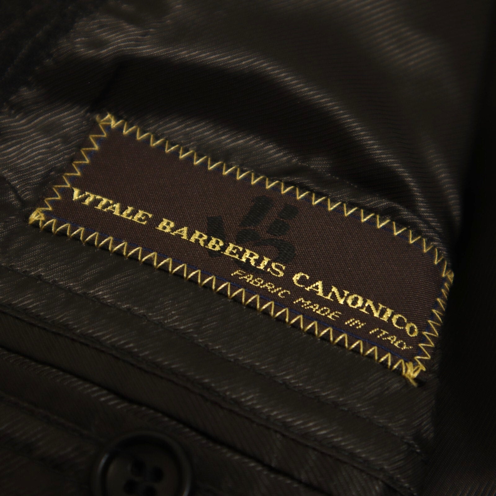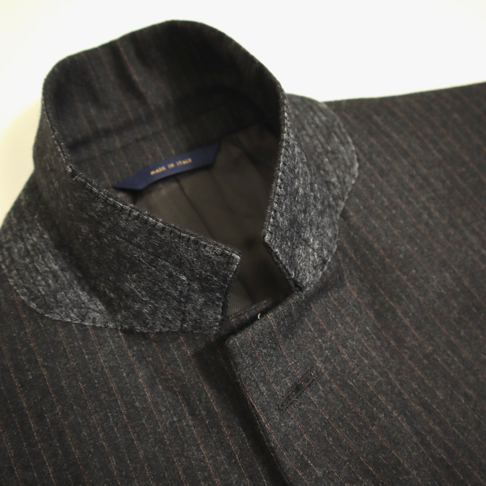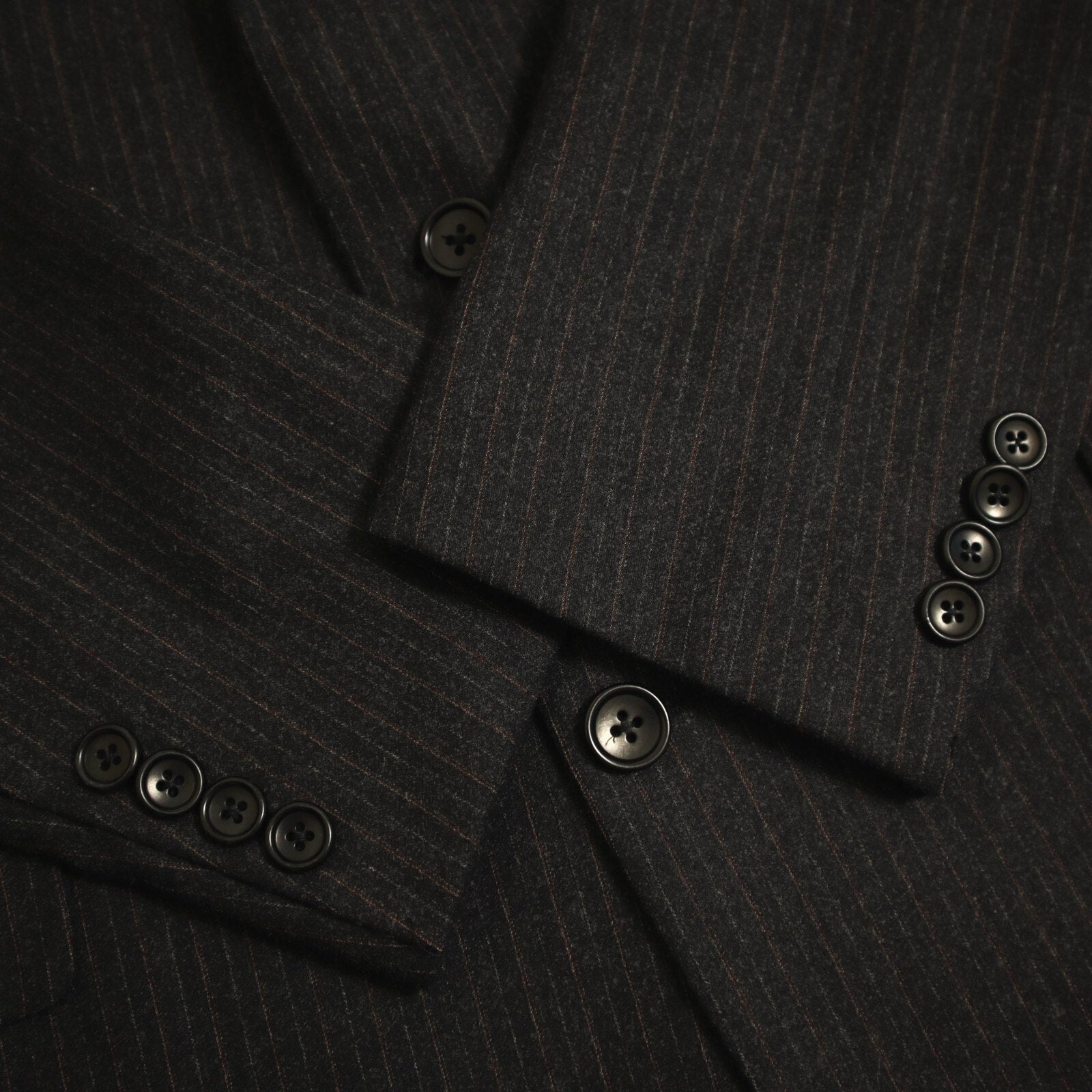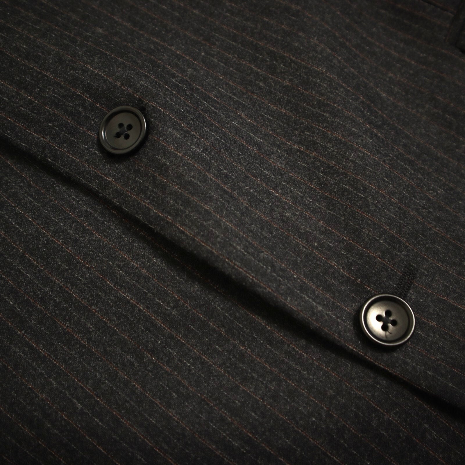 This suit is crafted with a classic 2 button, single-breasted design, featuring a single vented back for enhanced movement and fit. The jacket is equipped with flap pockets and 4 cuff buttons on each sleeve. The rich fabric is woven in a rich charcoal pinstripe and is composed of a flannel weight Italian wool, ensuring both luxury and comfort. The interior is fully lined and canvased. Because of the nature of pre owned clothes, measurements can change over time. Please note measurements.
