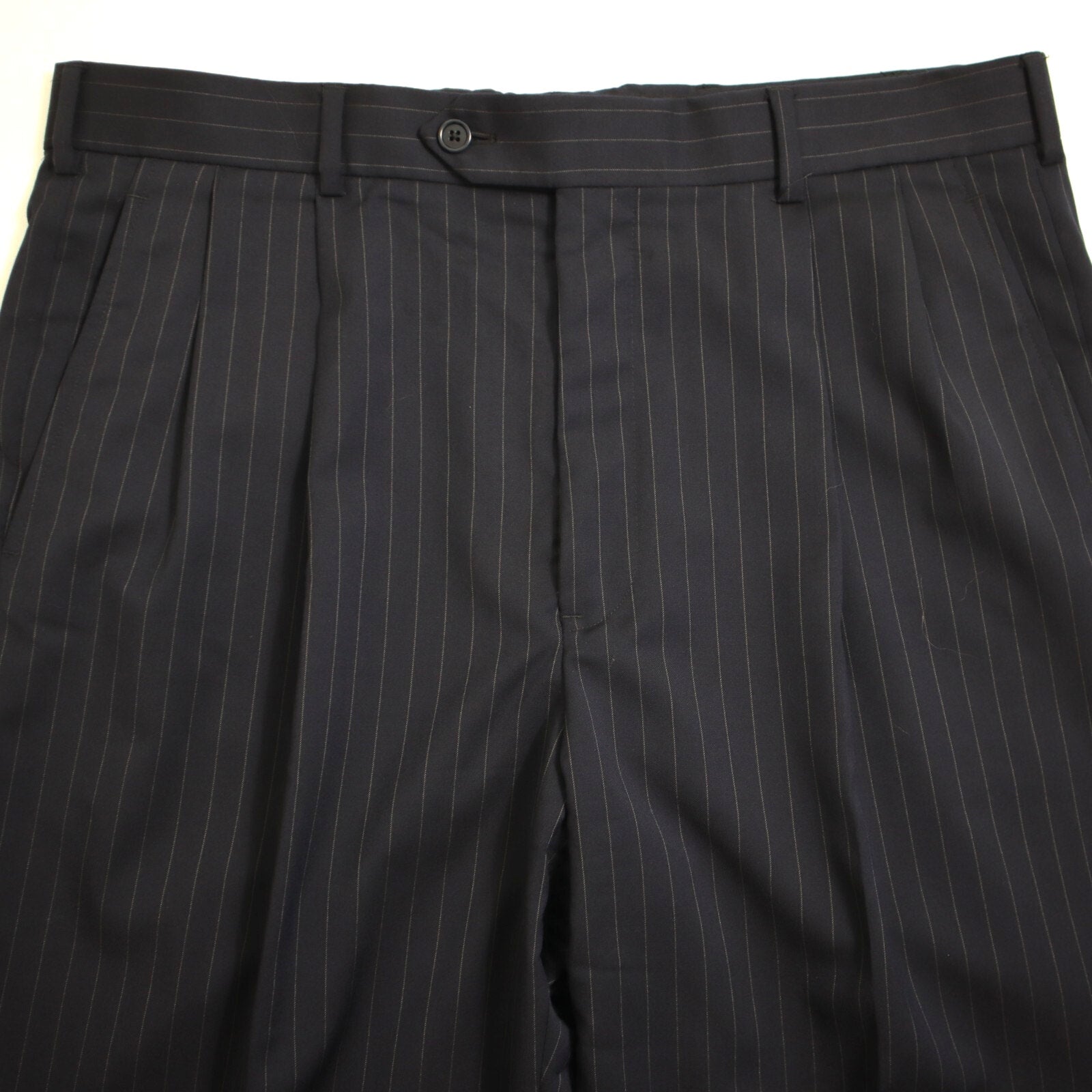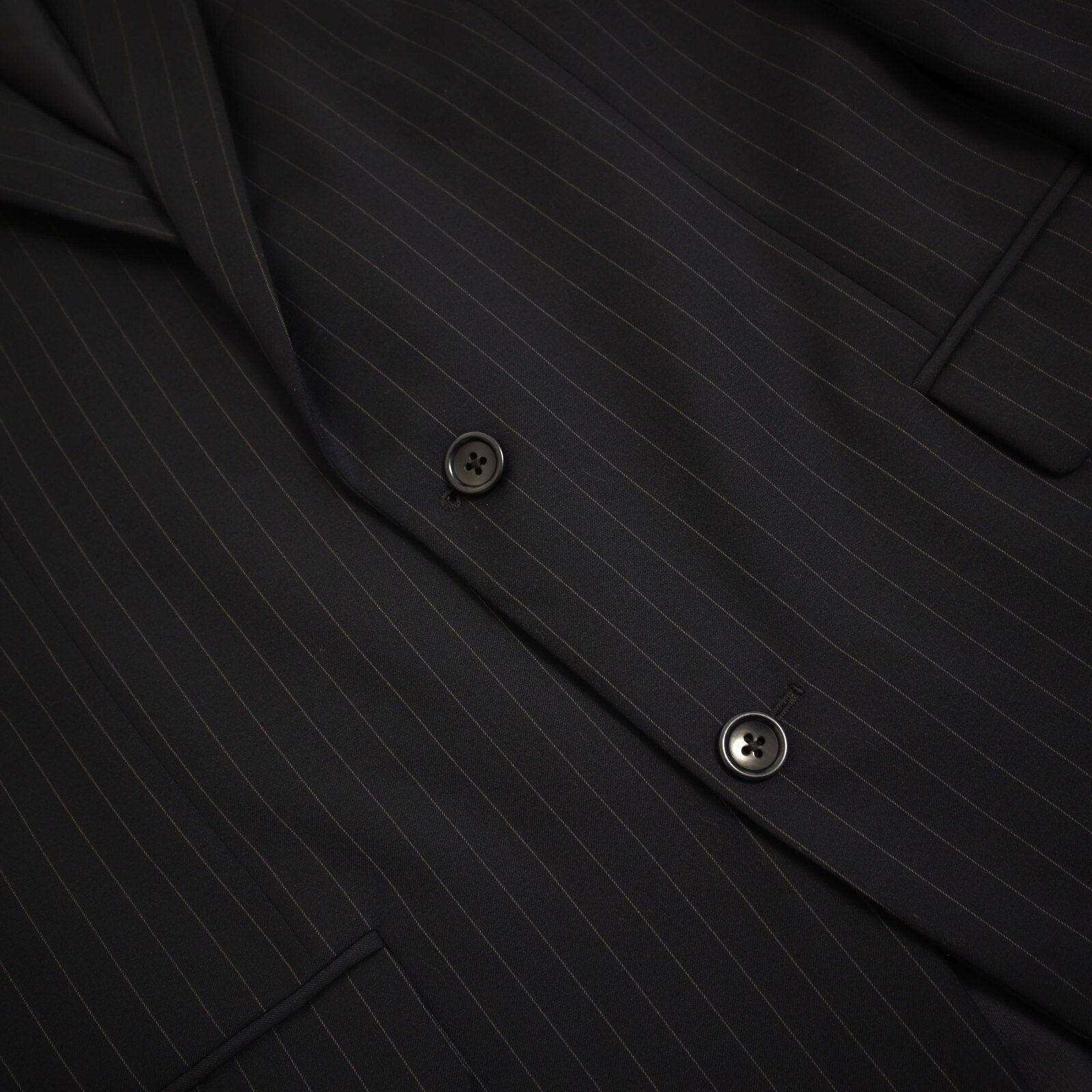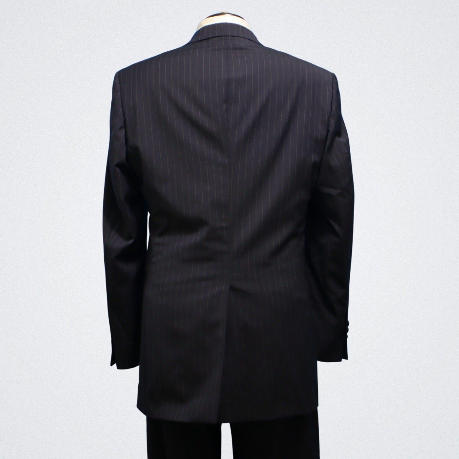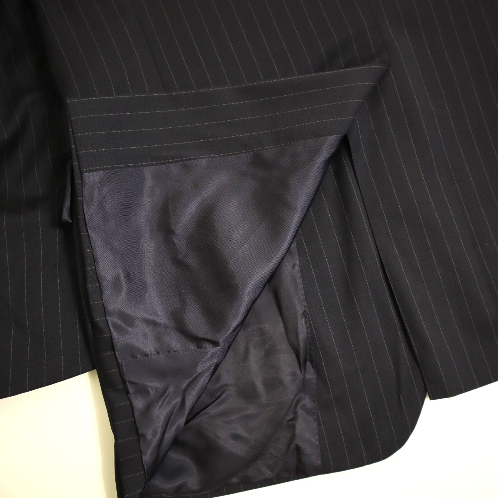 This suit is crafted with a classic 2 button, single-breasted design, featuring a single vented back for a more enhanced fit. The jacket is equipped with flap pockets and 4 cuff buttons on each sleeve. The rich fabric is woven in a beautiful striped navy and is composed of signature Estrato wool, ensuring both luxury and comfort. The interior is fully lined. Because of the nature of pre owned clothes, measurements can change over time. Please note measurements.