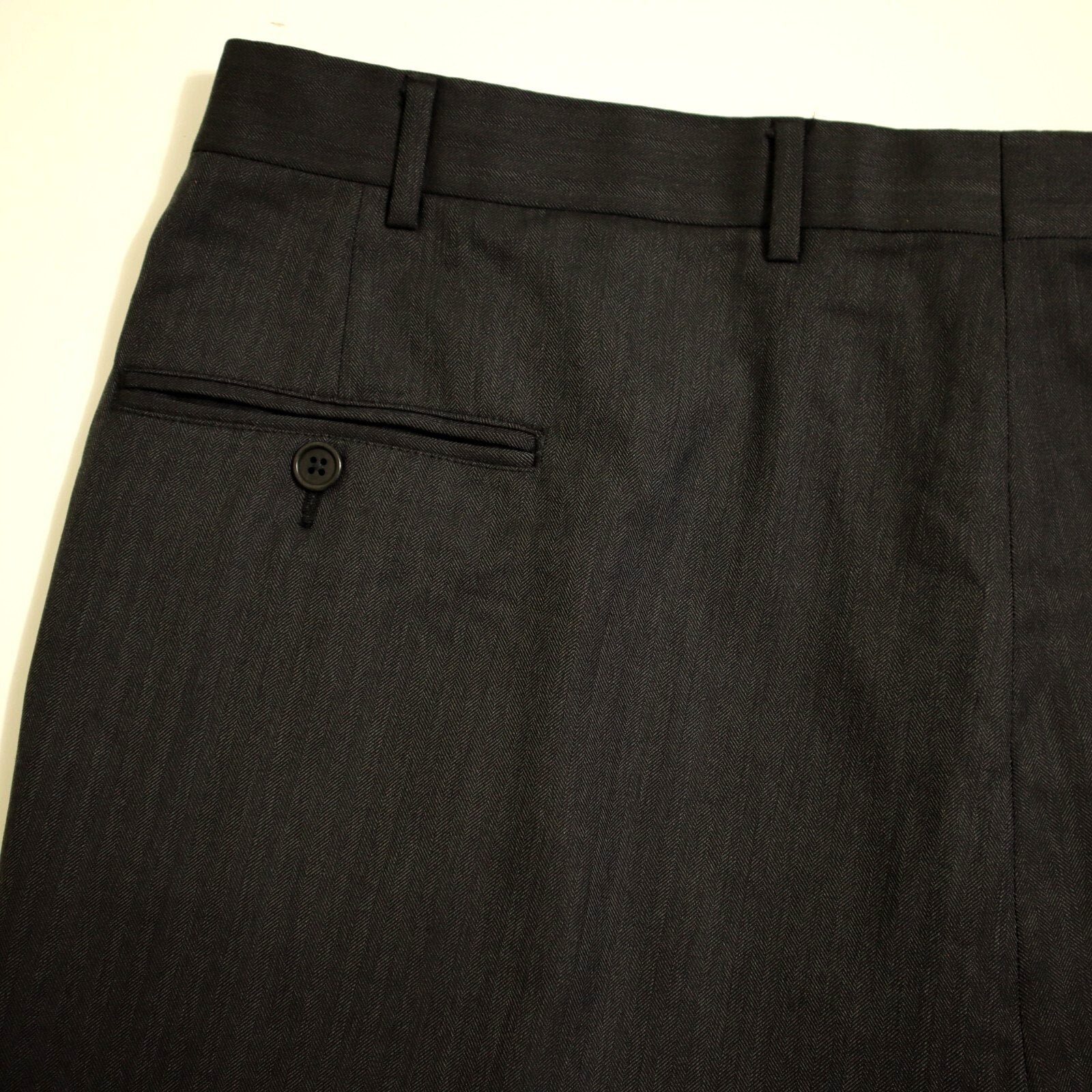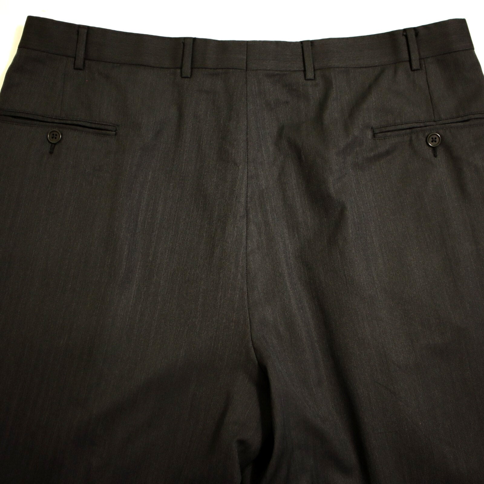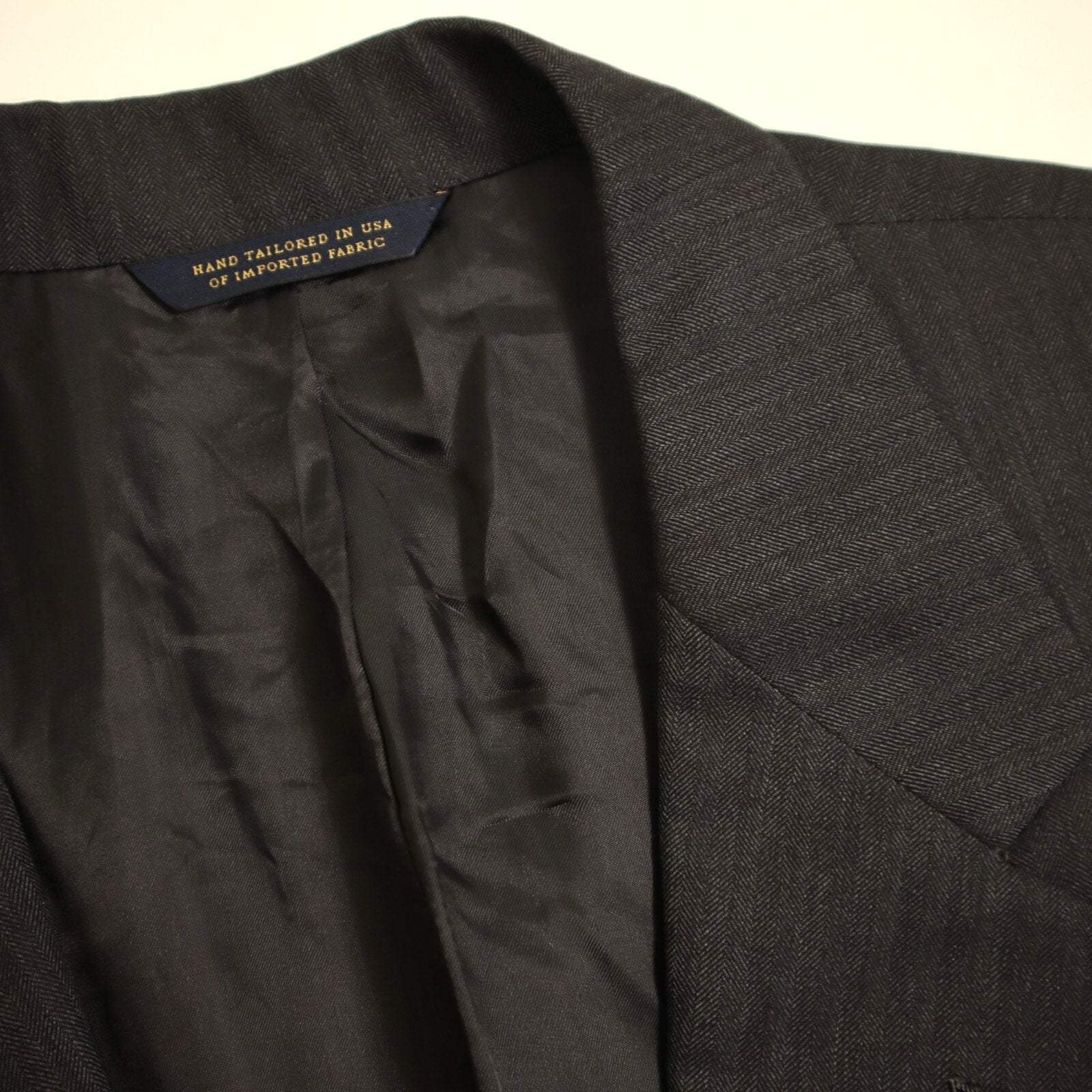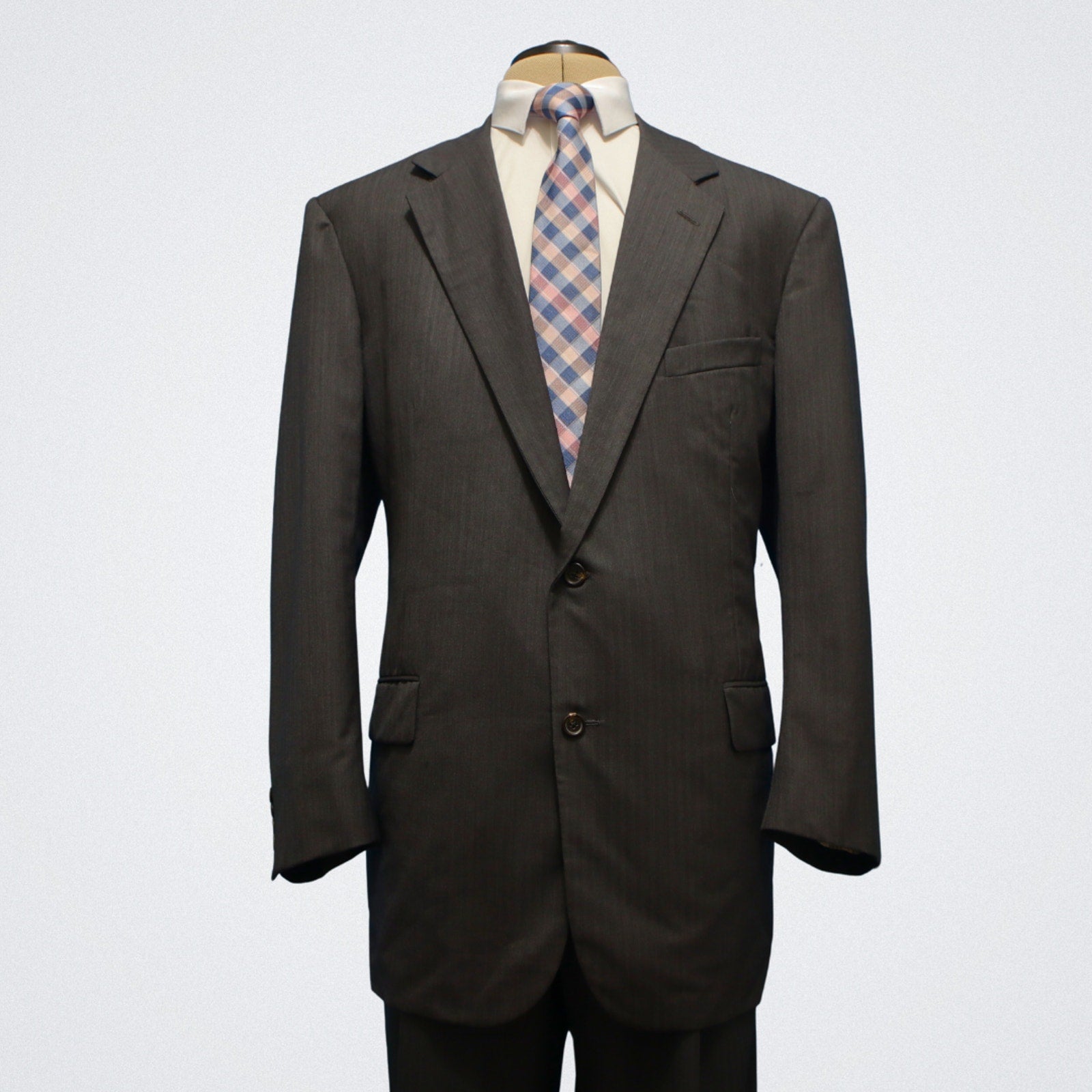 This suit is crafted with a classic 2 button, single-breasted design, featuring a single vented back for a more enhanced fit. The jacket is equipped with flap pockets and 4 cuff buttons on each sleeve. The rich fabric is woven in a beautiful mini herringbone gray and is composed of wool, ensuring both luxury and comfort. The interior is fully lined. Because of the nature of pre owned clothes, measurements can change over time. Please note measurements.
