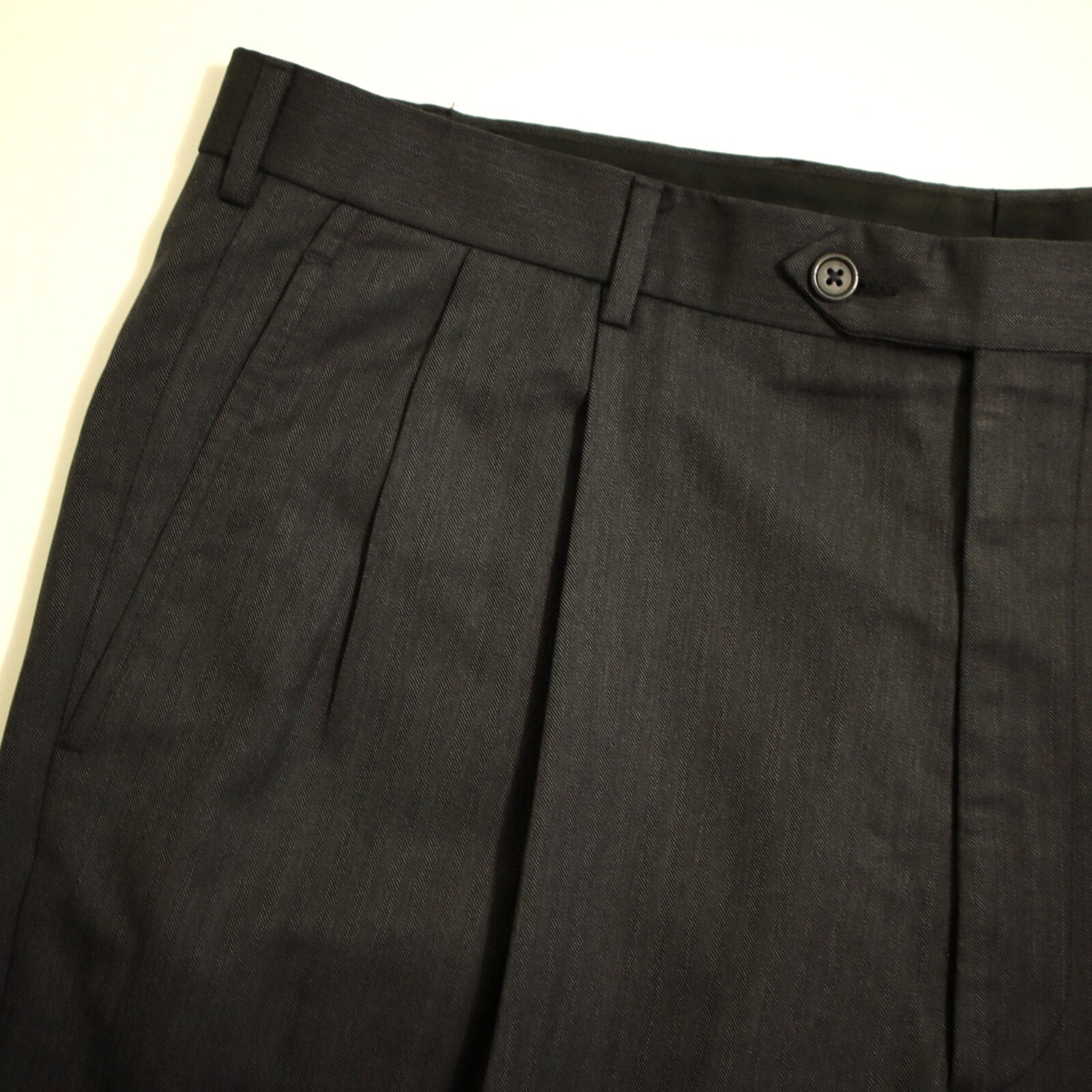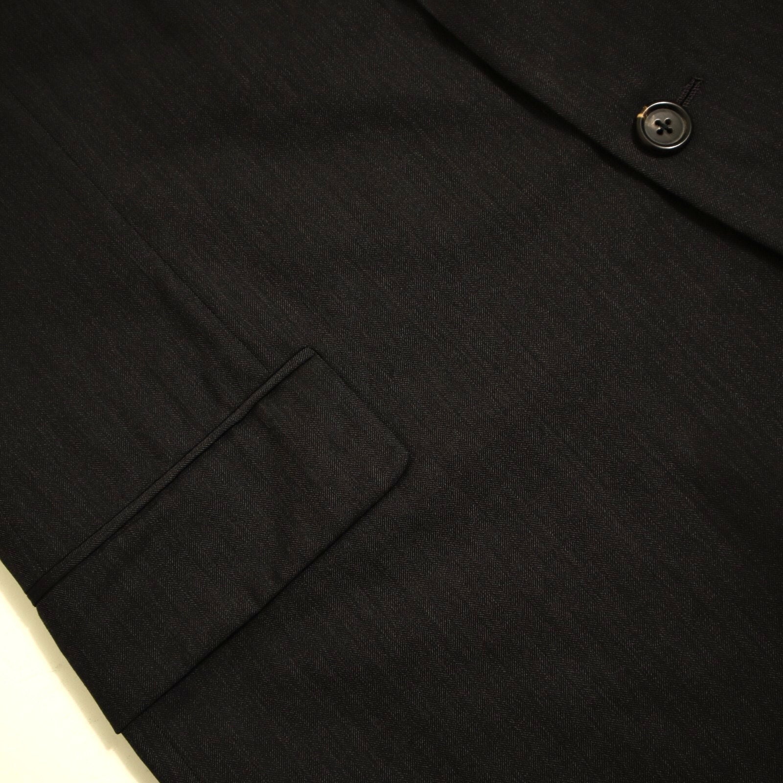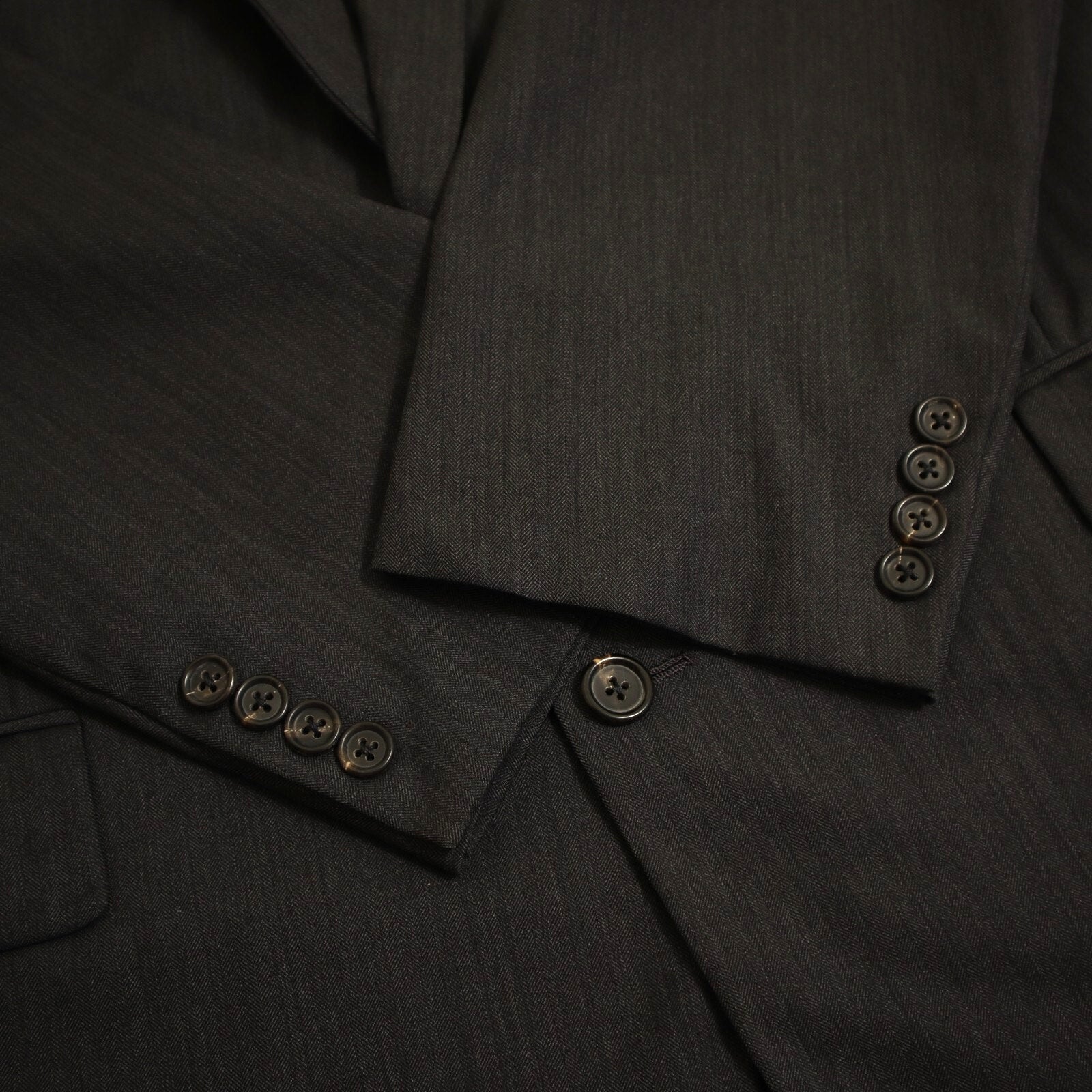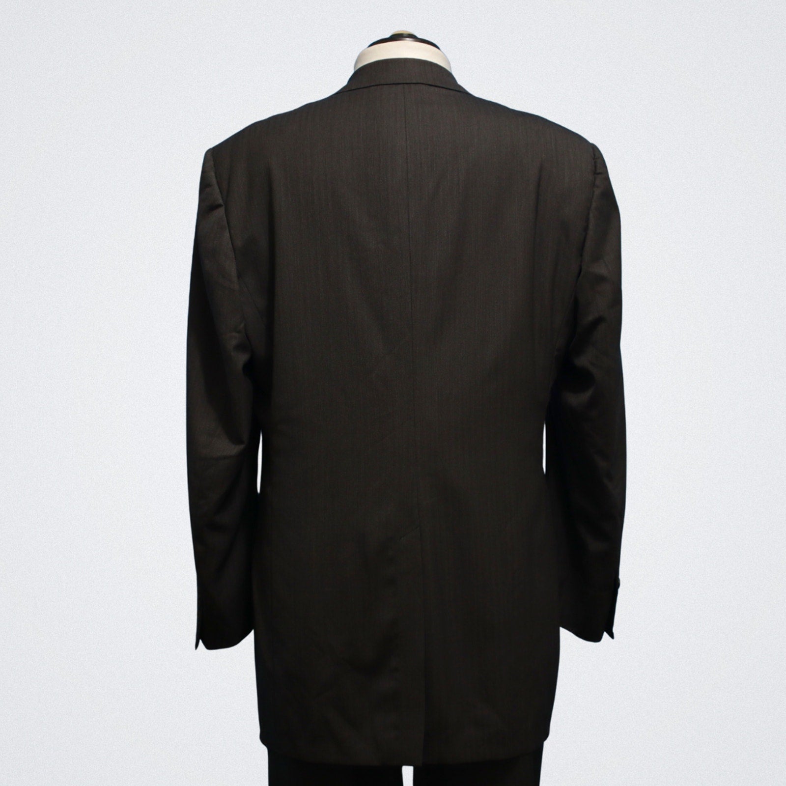 This suit is crafted with a classic 2 button, single-breasted design, featuring a single vented back for a more enhanced fit. The jacket is equipped with flap pockets and 4 cuff buttons on each sleeve. The rich fabric is woven in a beautiful mini herringbone gray and is composed of wool, ensuring both luxury and comfort. The interior is fully lined. Because of the nature of pre owned clothes, measurements can change over time. Please note measurements.