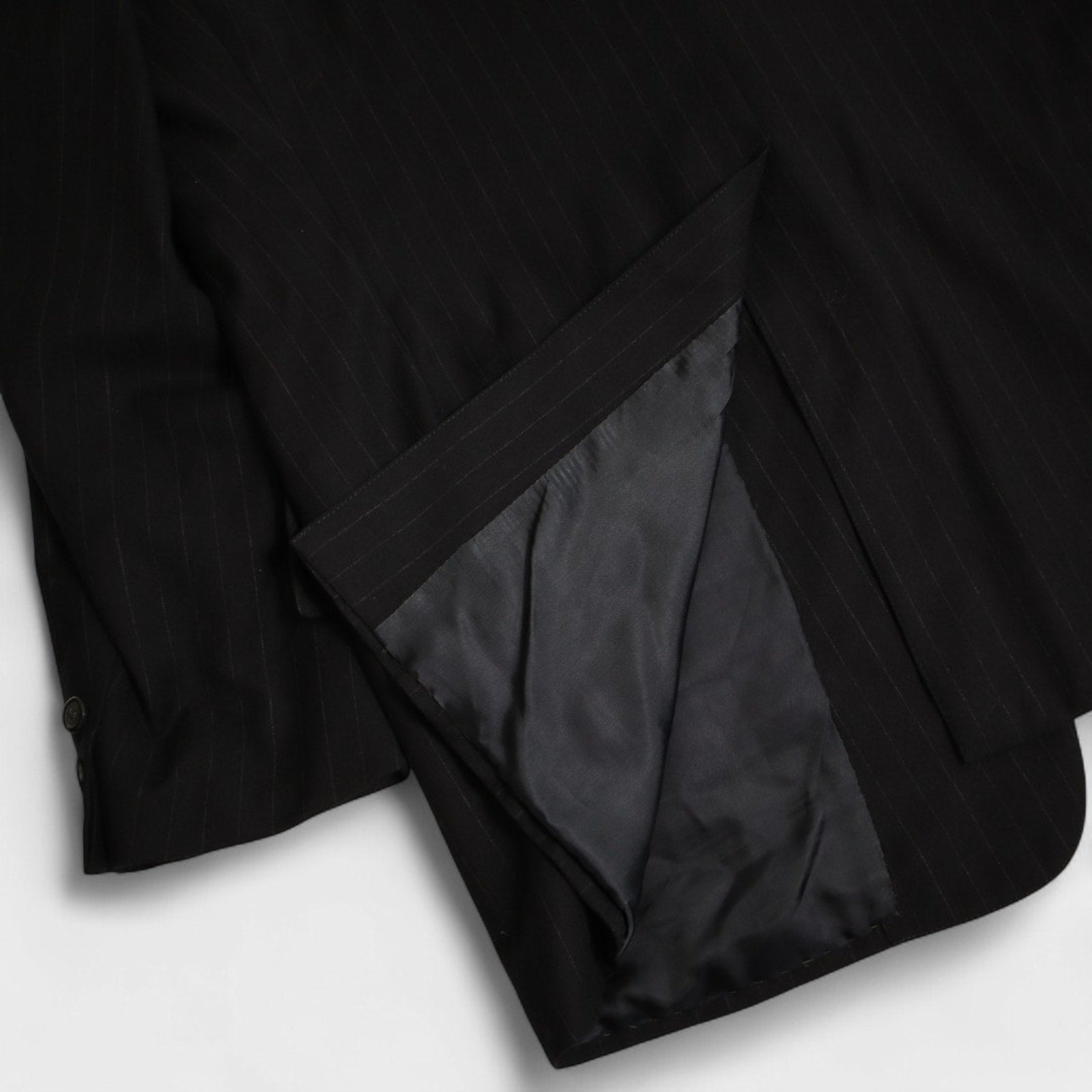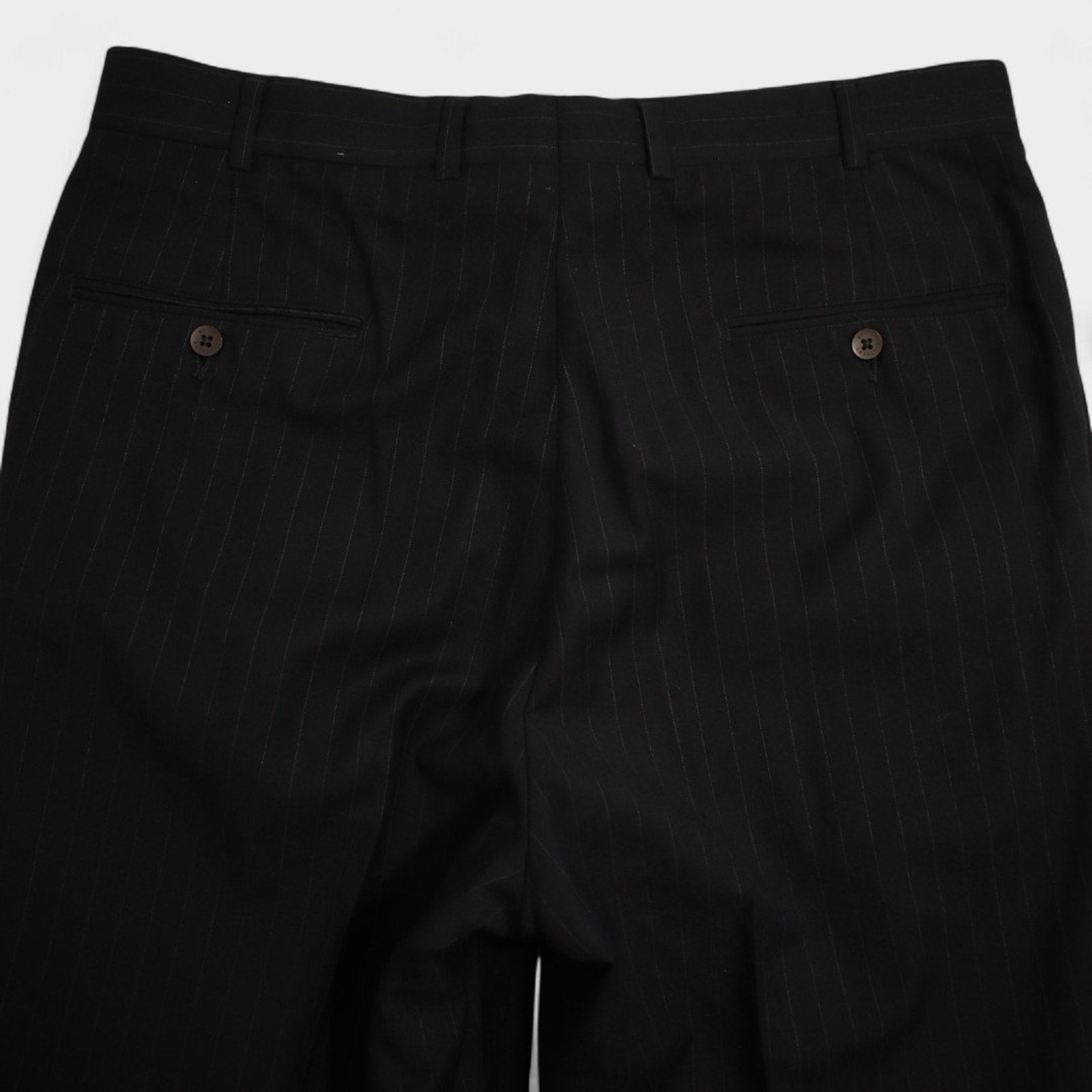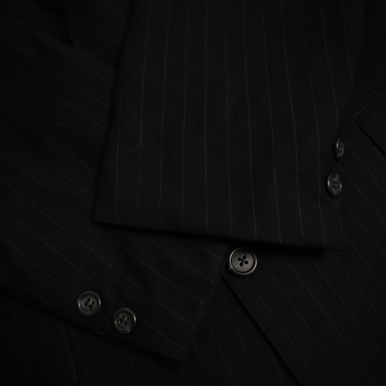 This suit is crafted with a classic 2 button, single-breasted design, featuring a single vented back for a more enhanced fit. The jacket is equipped with flap pockets and 2 cuff buttons on each sleeve. The rich fabric is woven in charcoal gray pinstripe and is composed of 100% wool, ensuring both luxury and comfort. The interior is fully lined. Because of the nature of pre owned clothes, measurements can change over time. Please note measurements.
