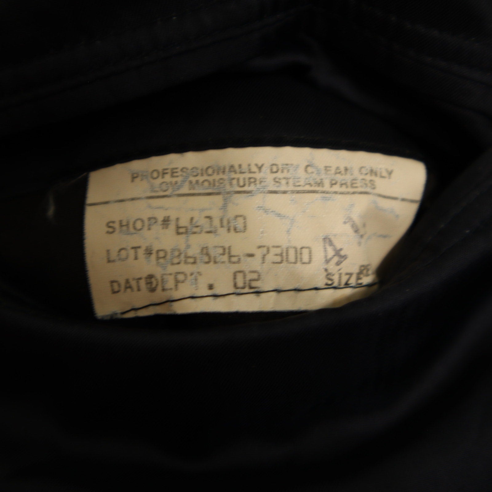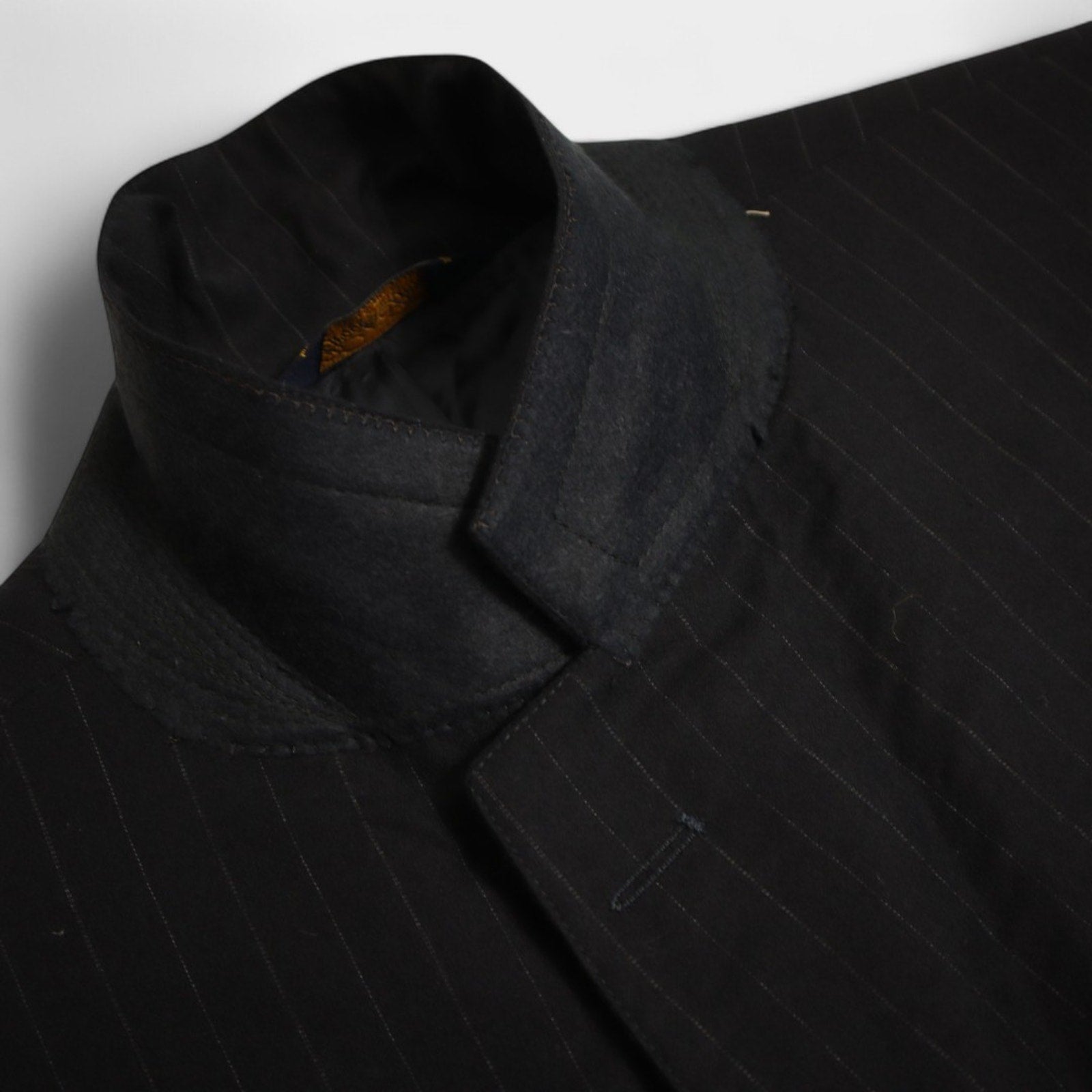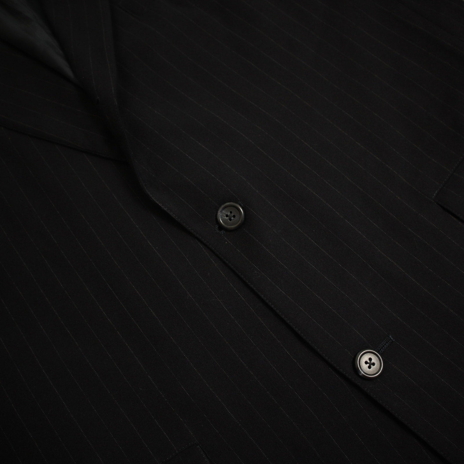This suit is crafted with a classic 2 button, single-breasted design, featuring a single vented back for a more enhanced fit. The jacket is equipped with flap pockets and 2 cuff buttons on each sleeve. The rich fabric is woven in charcoal gray pinstripe and is composed of 100% wool, ensuring both luxury and comfort. The interior is fully lined. Because of the nature of pre owned clothes, measurements can change over time. Please note measurements.