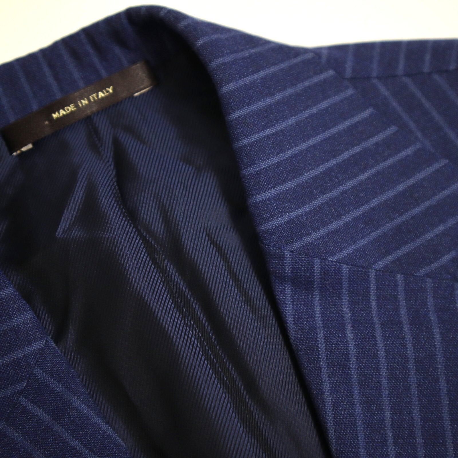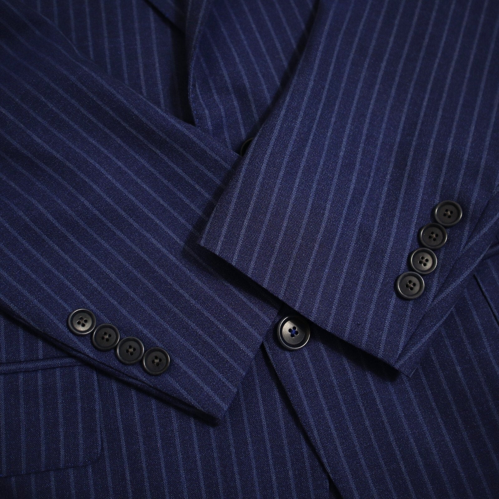This mint Paul Stuart Napoli sport coat is crafted with a classic 2 button, single breasted design, featuring a double vented back for enhanced movement and fit. The jacket is equipped with flap pockets and 4 cuff buttons on each sleeve. The rich fabric is woven in a rich blue pinstripe and is composed of a wool woven and made in Italy, ensuring both luxury and comfort. The interior is half lined and unstructured. Because of the nature of pre owned clothes, measurements can change over time. Please note measurements.