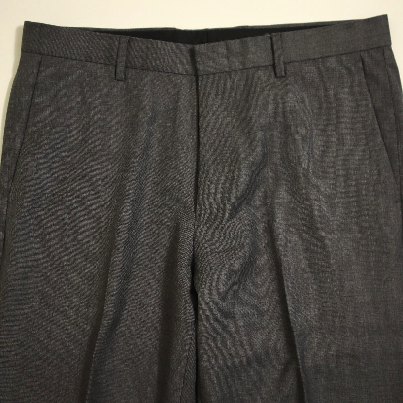 This suit is crafted with a classic 2 button, single-breasted design, featuring a double vented back for enhanced movement and fit. The jacket is equipped with flap pockets and 4 cuff buttons on each sleeve. The rich fabric is woven in a classic heathered gray and is composed of quality Italian wool, ensuring both luxury and comfort. The interior is fully lined. Jacket has been professionally altered to a 40 inch chest and 37 inch waist. Because of the nature of pre owned clothes, measurements can change over time. Please note measurements.