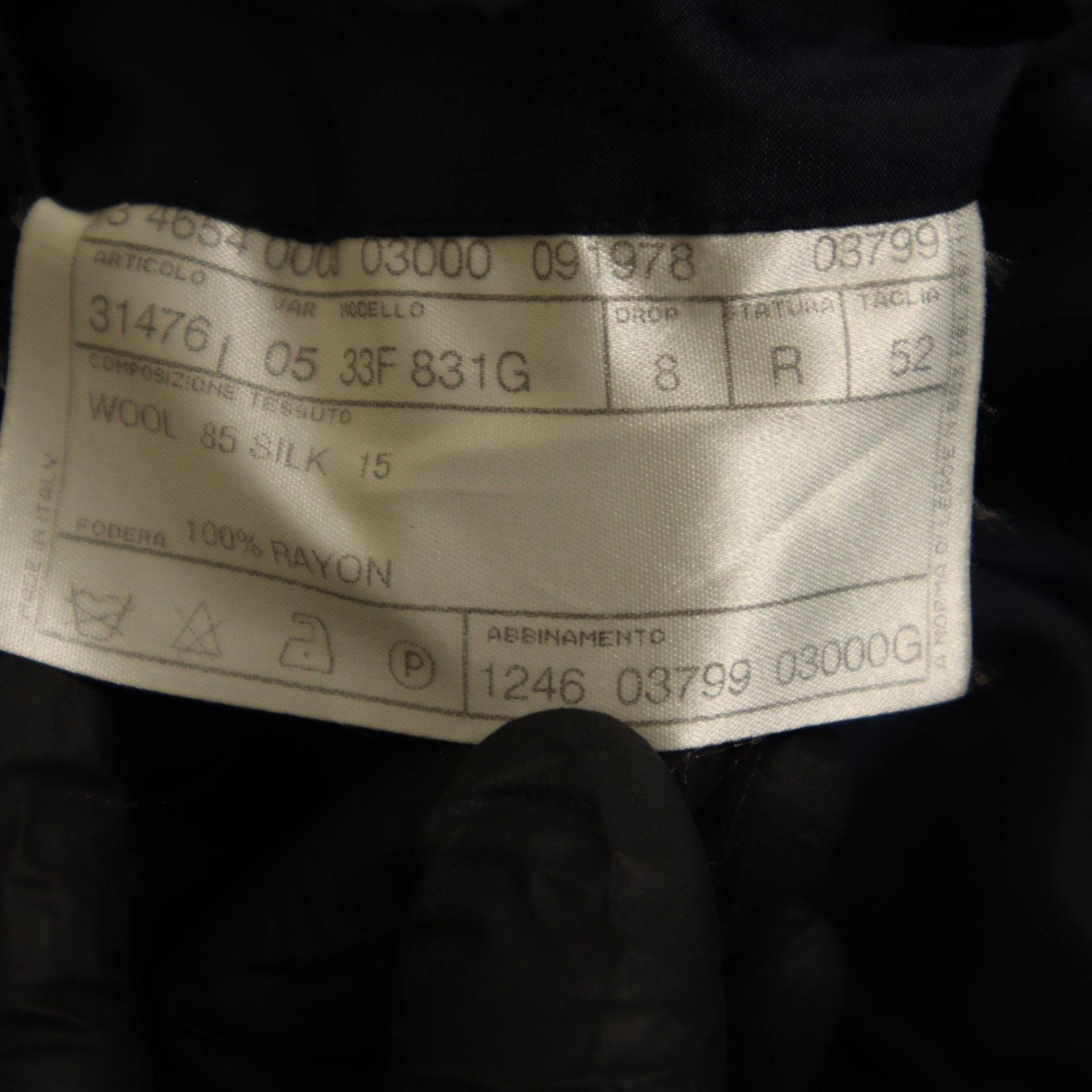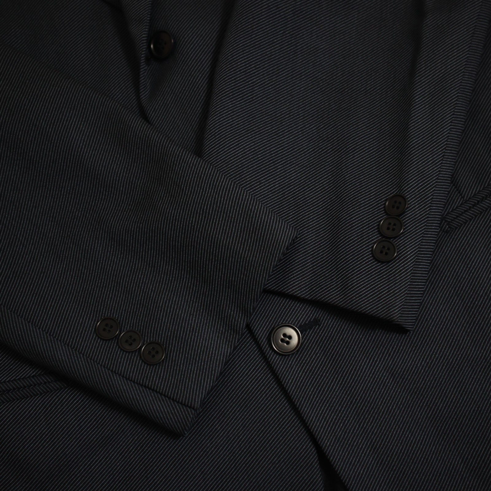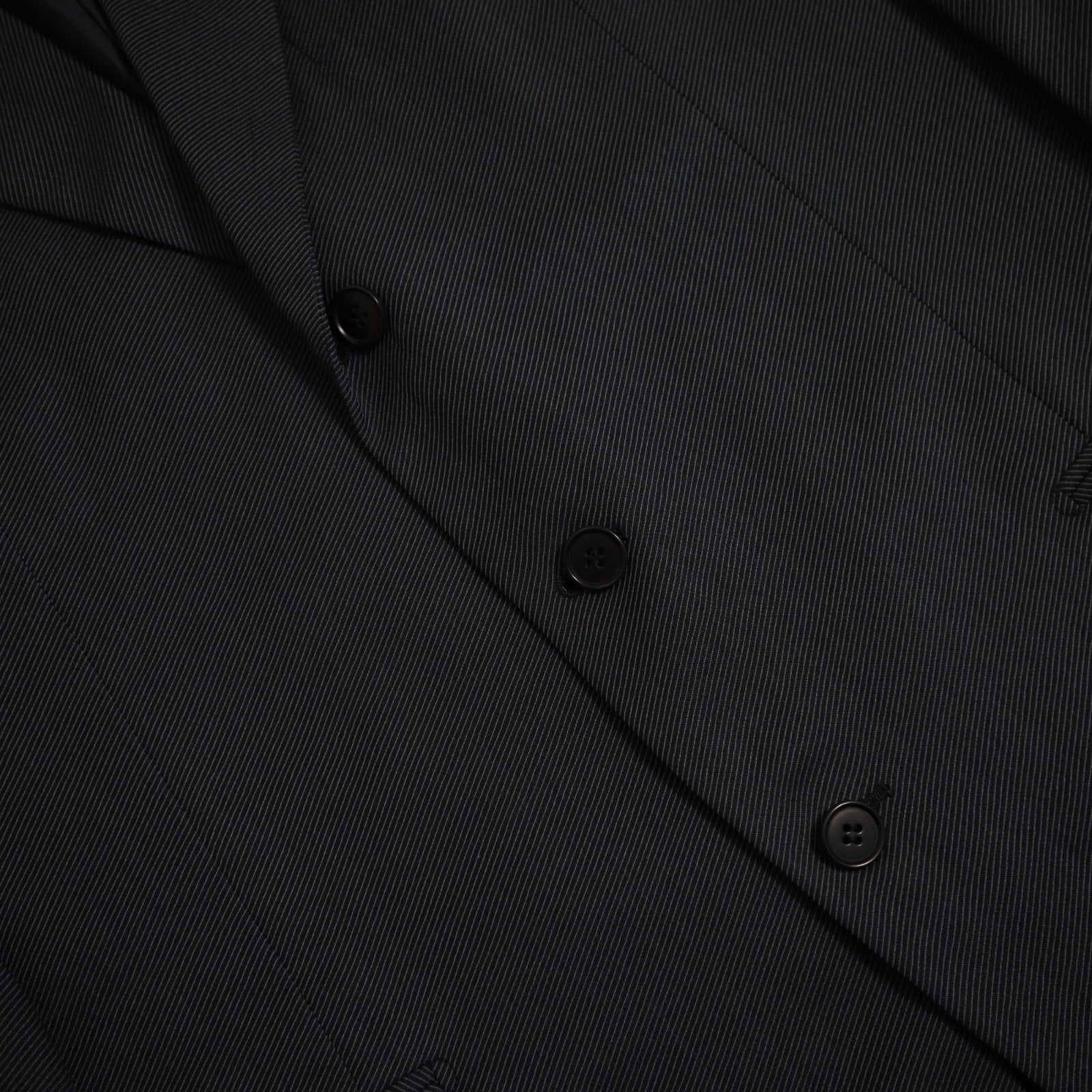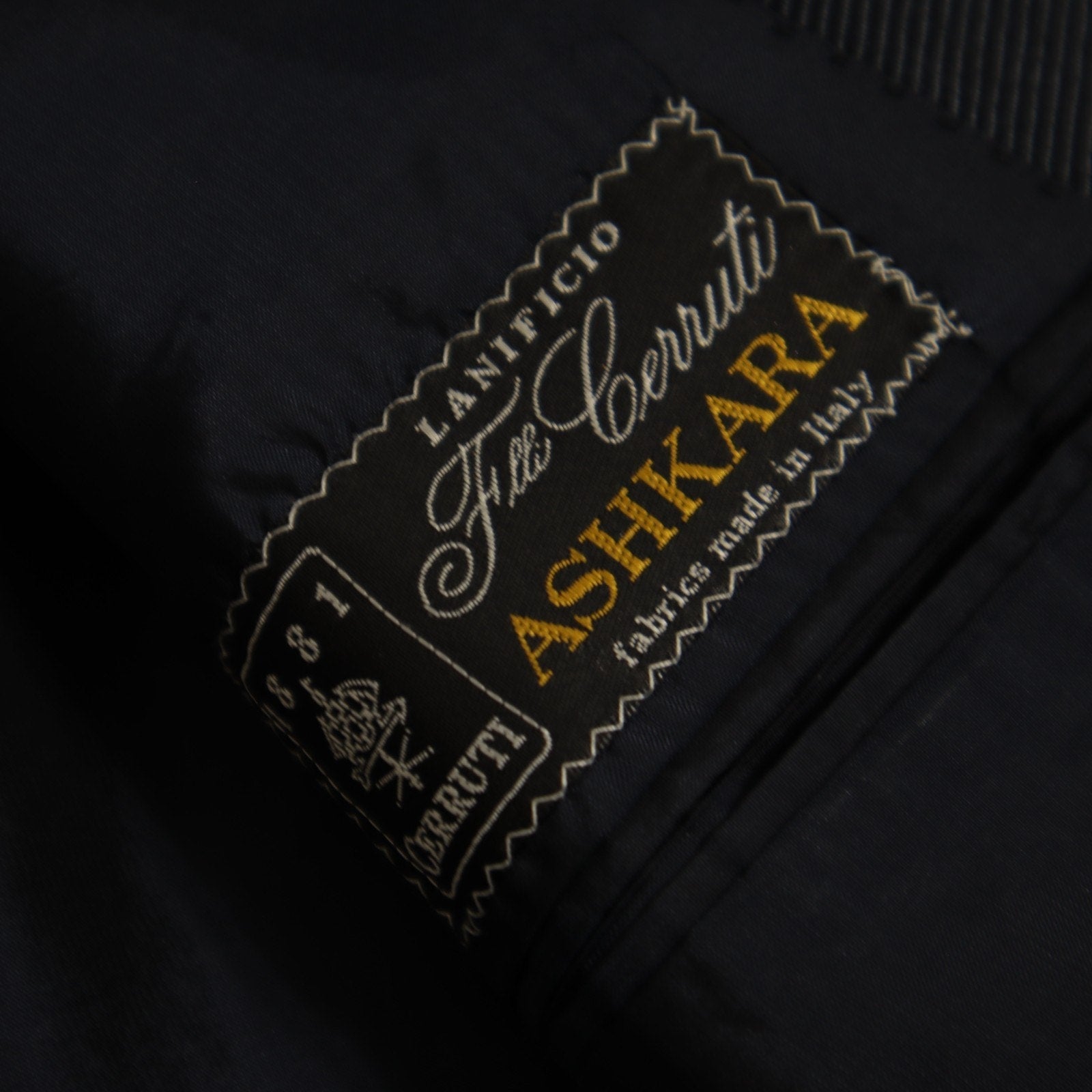 This suit is crafted with a classic 3 button, single-breasted design, featuring a ventless back for a more enhanced fit. The jacket is equipped with flap pockets and 3 cuff buttons on each sleeve. The rich fabric is woven in a beautiful dark silver blue whipcord and is composed of a Lanificio Cerruti wool, ensuring both luxury and comfort. The interior is fully lined. High quality professional repair has been made to jacket as seen in photo number 3. Because of the nature of pre owned clothes, measurements can change over time. Please note measurements.