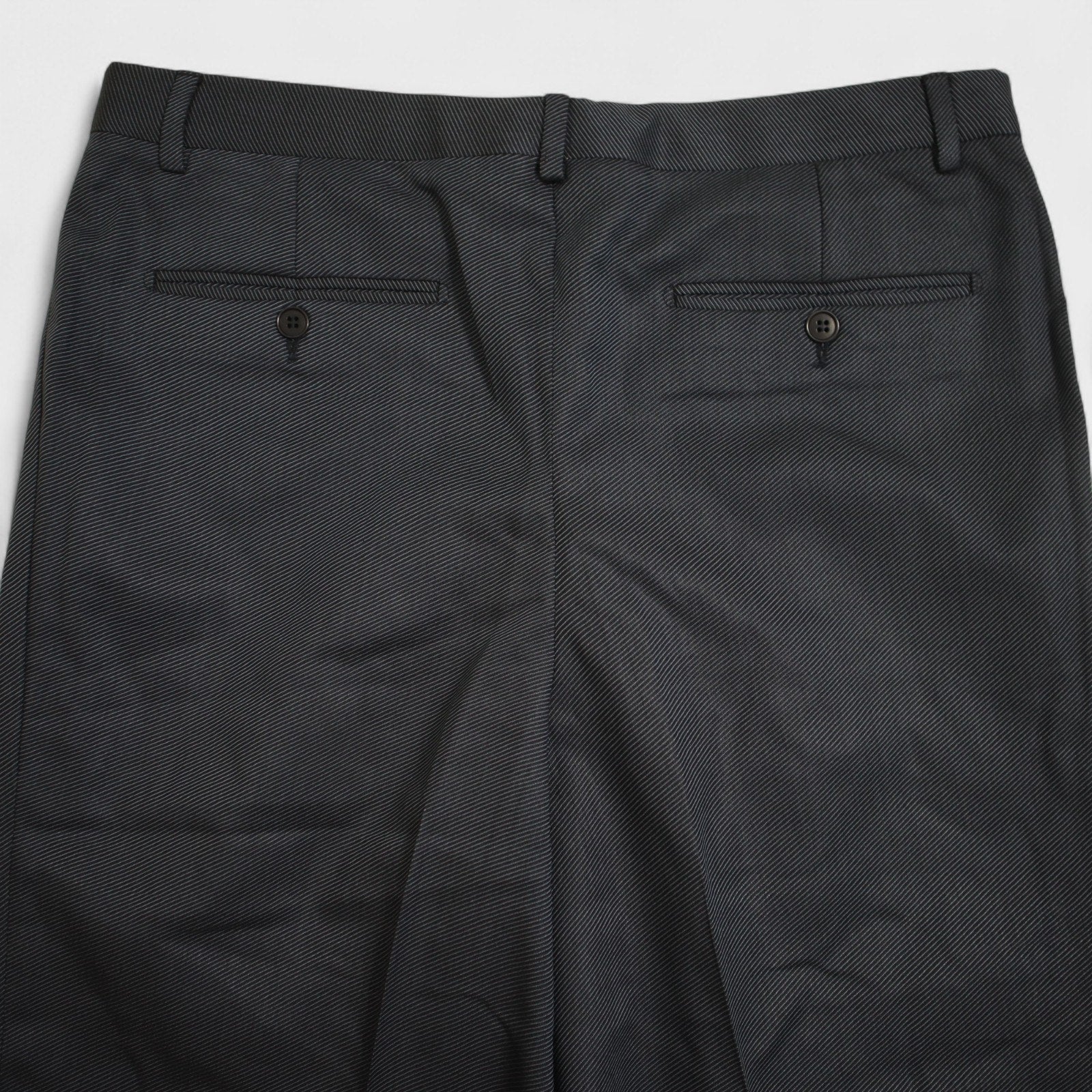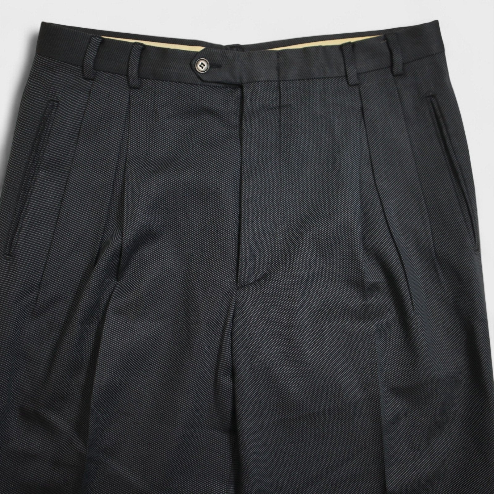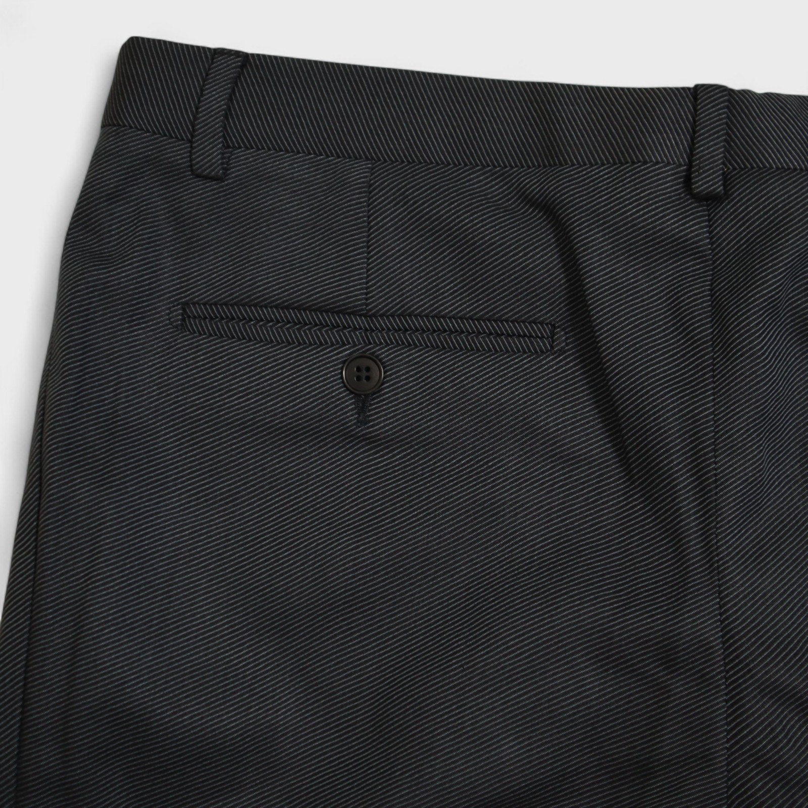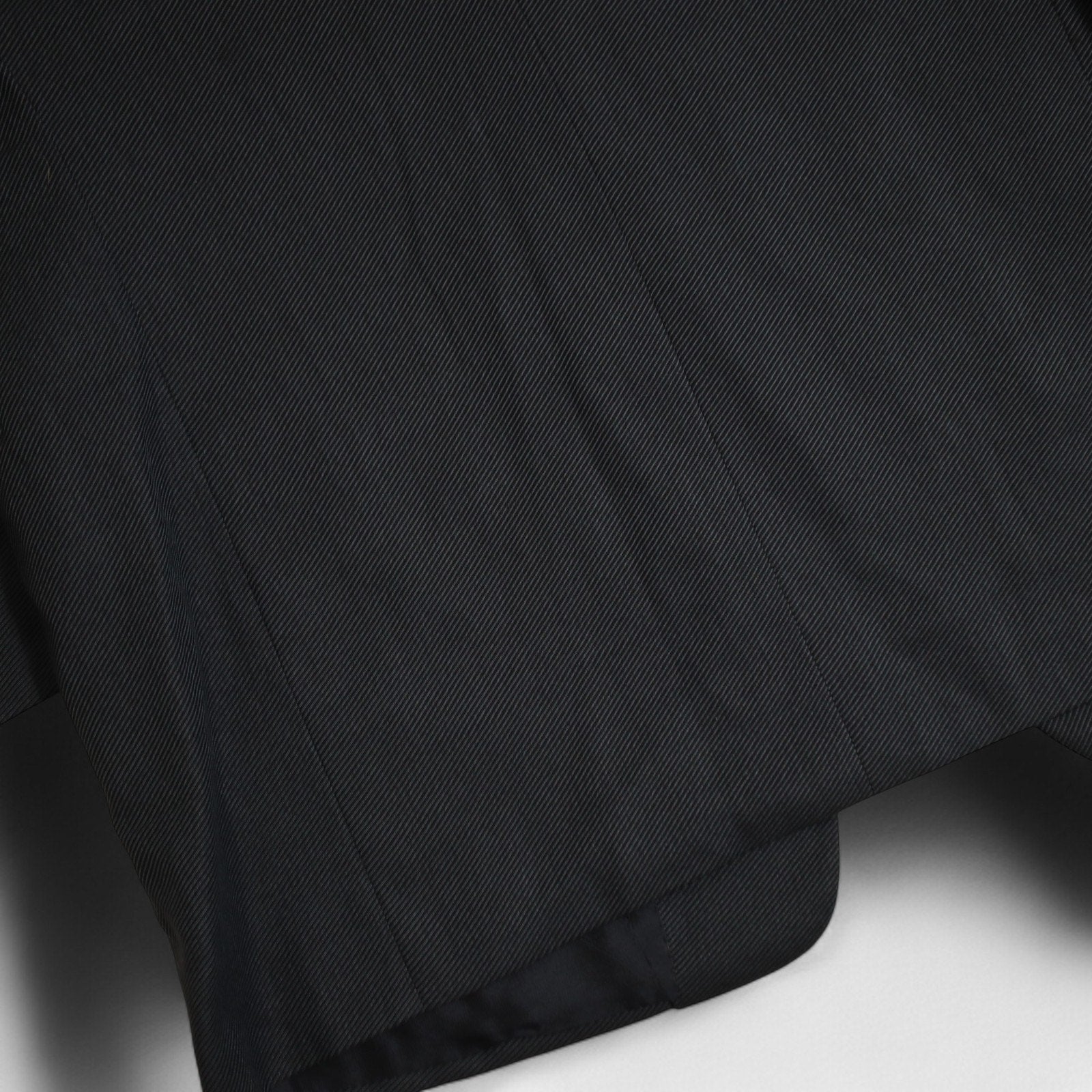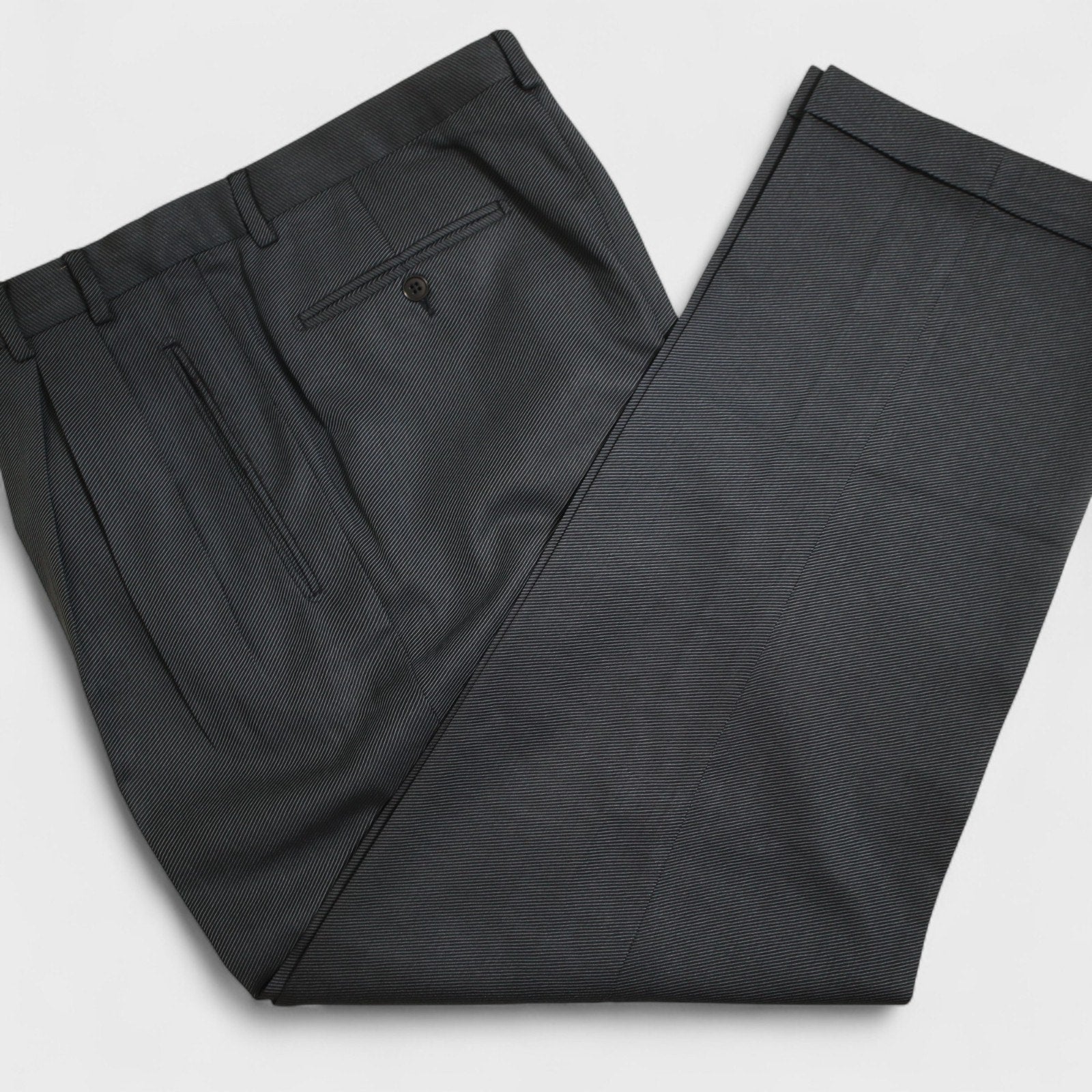 This suit is crafted with a classic 3 button, single-breasted design, featuring a ventless back for a more enhanced fit. The jacket is equipped with flap pockets and 3 cuff buttons on each sleeve. The rich fabric is woven in a beautiful dark silver blue whipcord and is composed of a Lanificio Cerruti wool, ensuring both luxury and comfort. The interior is fully lined. High quality professional repair has been made to jacket as seen in photo number 3. Because of the nature of pre owned clothes, measurements can change over time. Please note measurements.