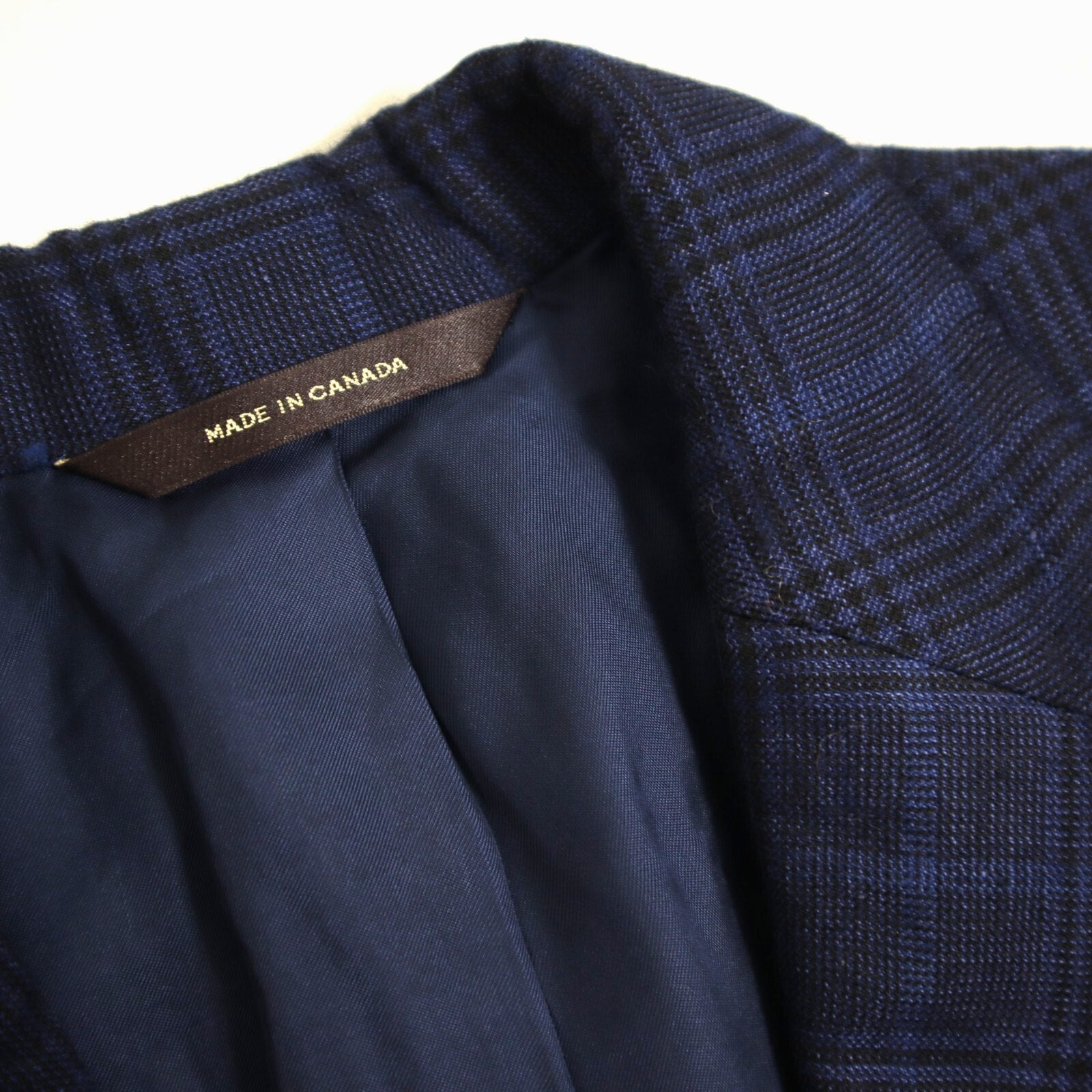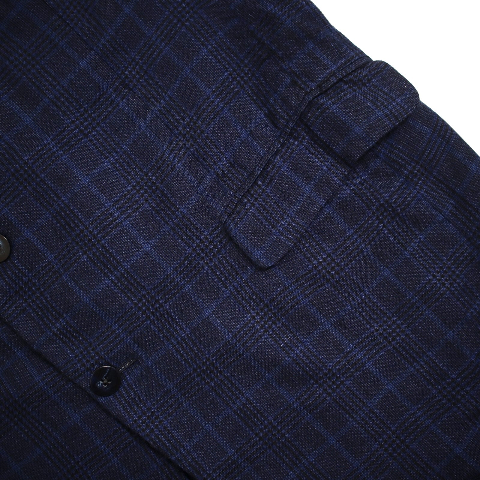 This sport coat is crafted with a classic 2 button, single breasted design, featuring a single vented back for enhanced movement and fit. The jacket is equipped with flap pockets and 4 cuff buttons on each sleeve. The rich fabric is woven in a rich blue plaid and is composed of a wool, linen, silk blend woven in Italy, ensuring both luxury and comfort. The interior is fully lined. Because of the nature of pre owned clothes, measurements can change over time. Please note measurements.