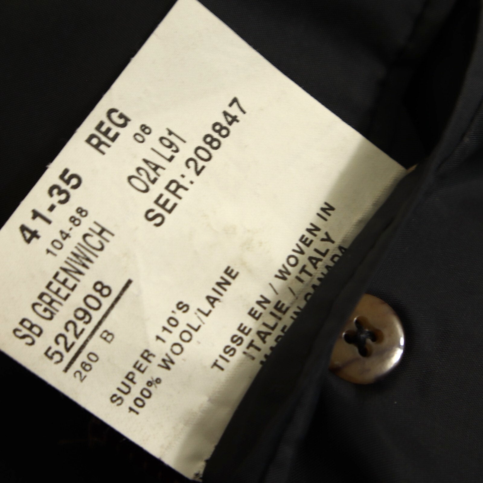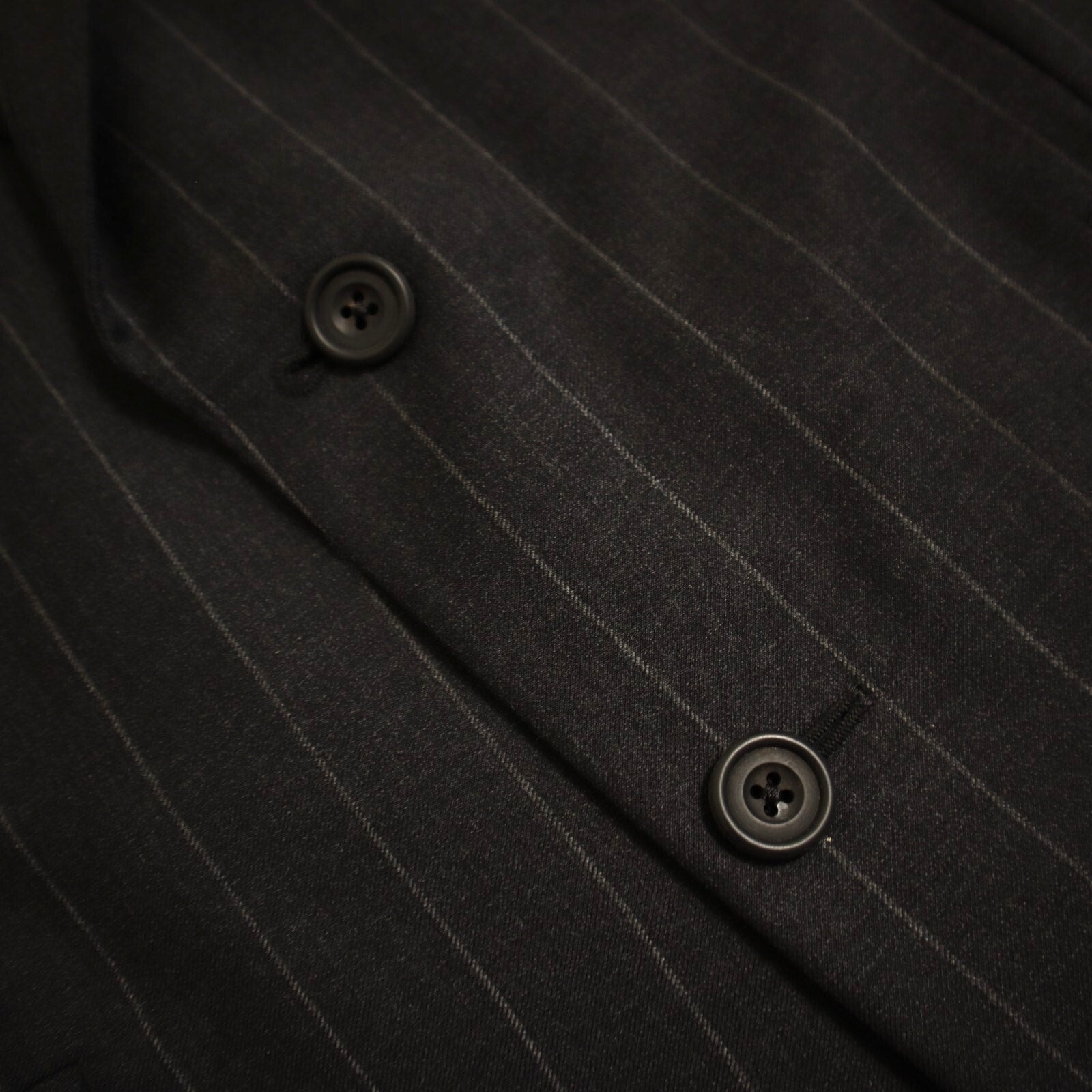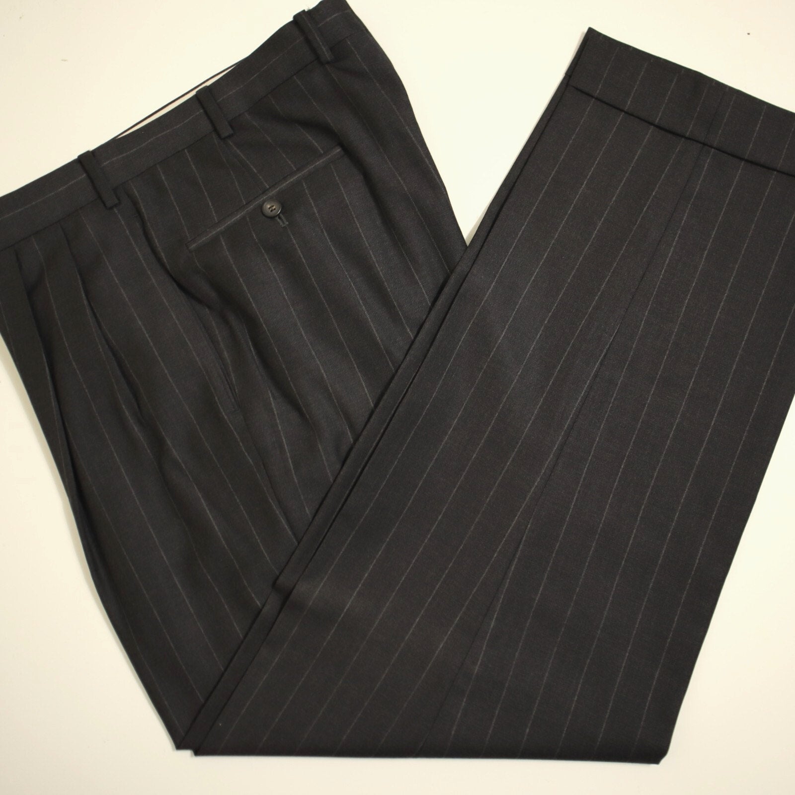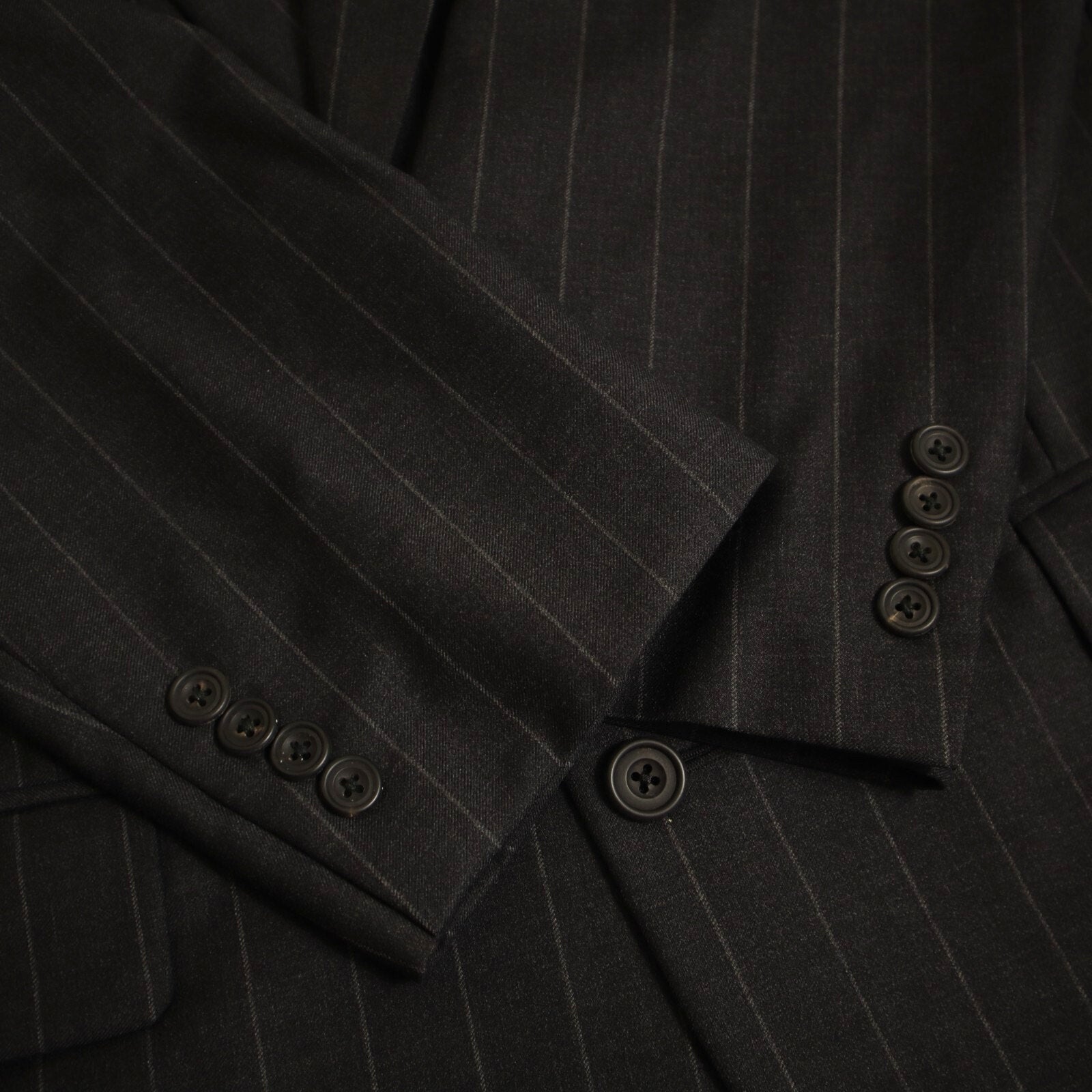 This suit is crafted with a classic 2 button, single-breasted design, featuring a single vented back for a more enhanced fit. The jacket is equipped with flap pockets and 4 cuff buttons on each sleeve. The rich fabric is woven in charcoal gray pinstripe and is composed of super 110's wool, ensuring both luxury and comfort. The interior is fully lined and fully canvased. Because of the nature of pre owned clothes, measurements can change over time. Please note measurements.