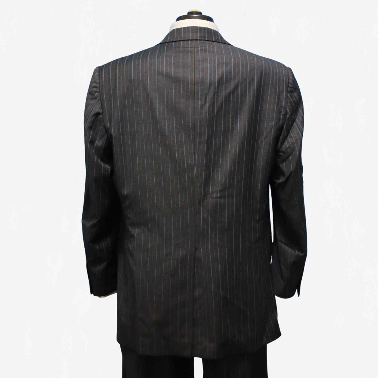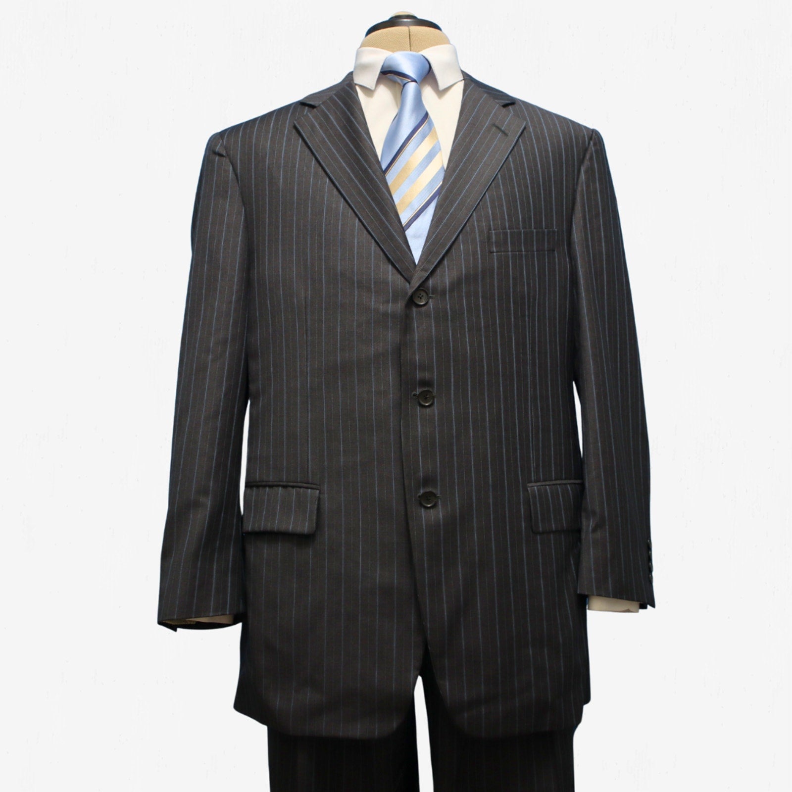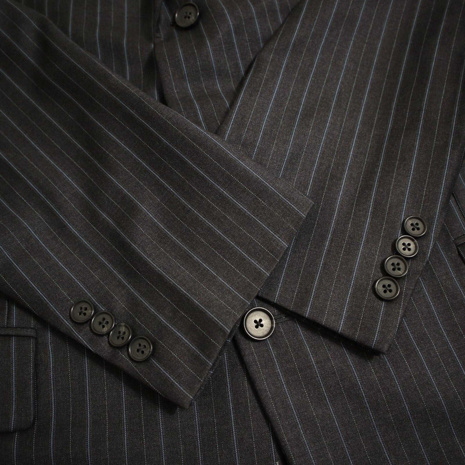 This suit is crafted with a classic 3 button, single-breasted design, featuring a single vented back for a more enhanced fit. The jacket is equipped with flap pockets and 4 cuff buttons on each sleeve. The rich fabric is woven in charcoal gray with blue pinstripe and is composed of 100% super 120's wool, ensuring both luxury and comfort. The interior is fully lined and fully canvased. Because of the nature of pre owned clothes, measurements can change over time. Please note measurements.