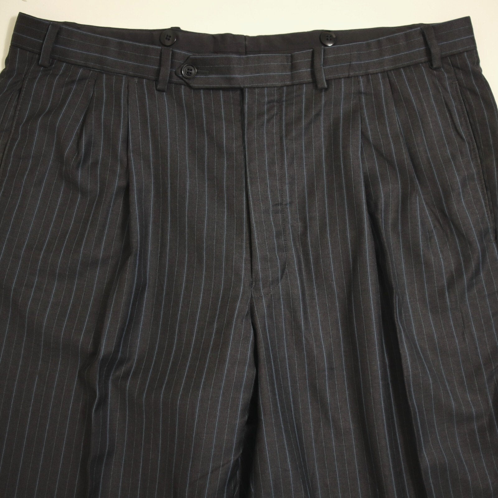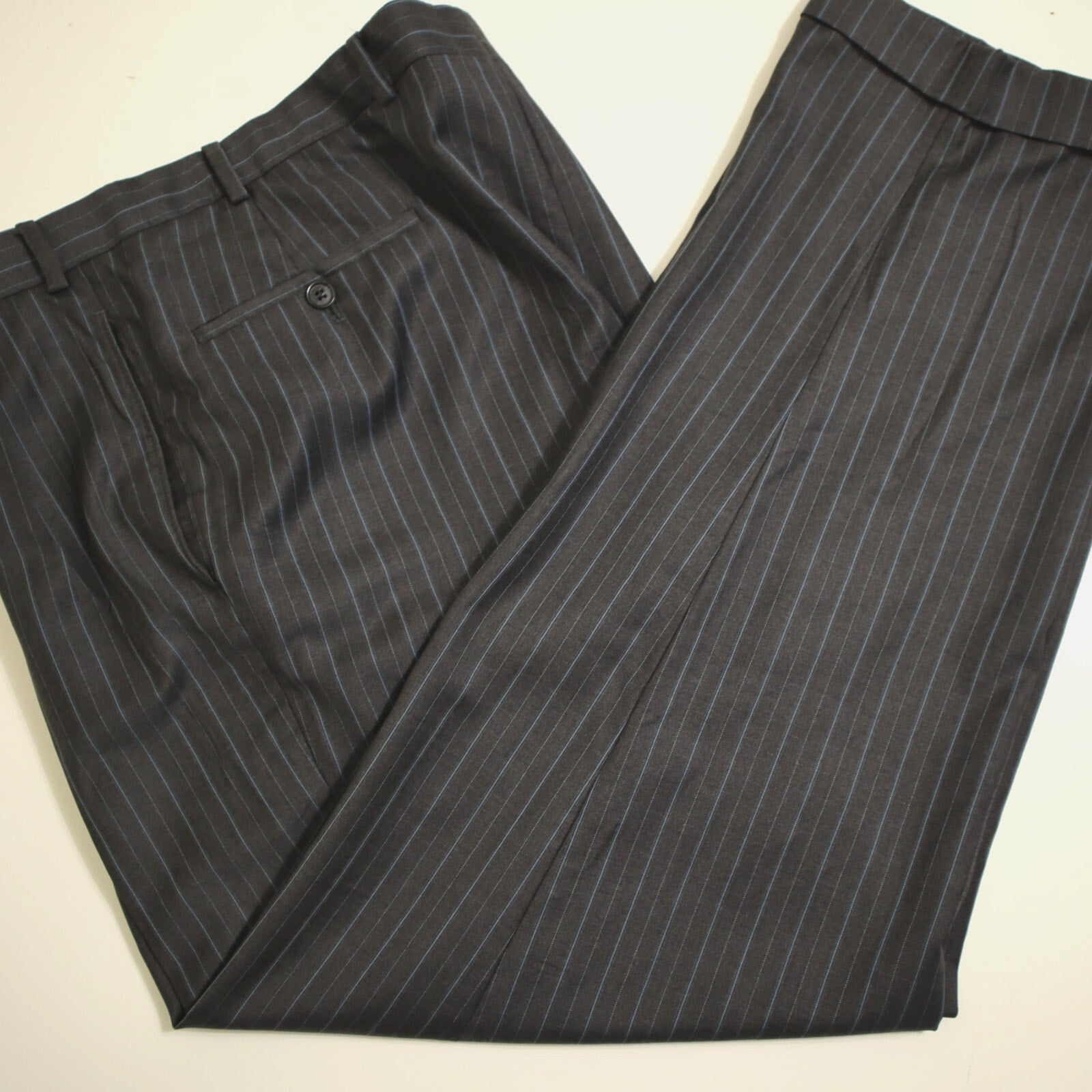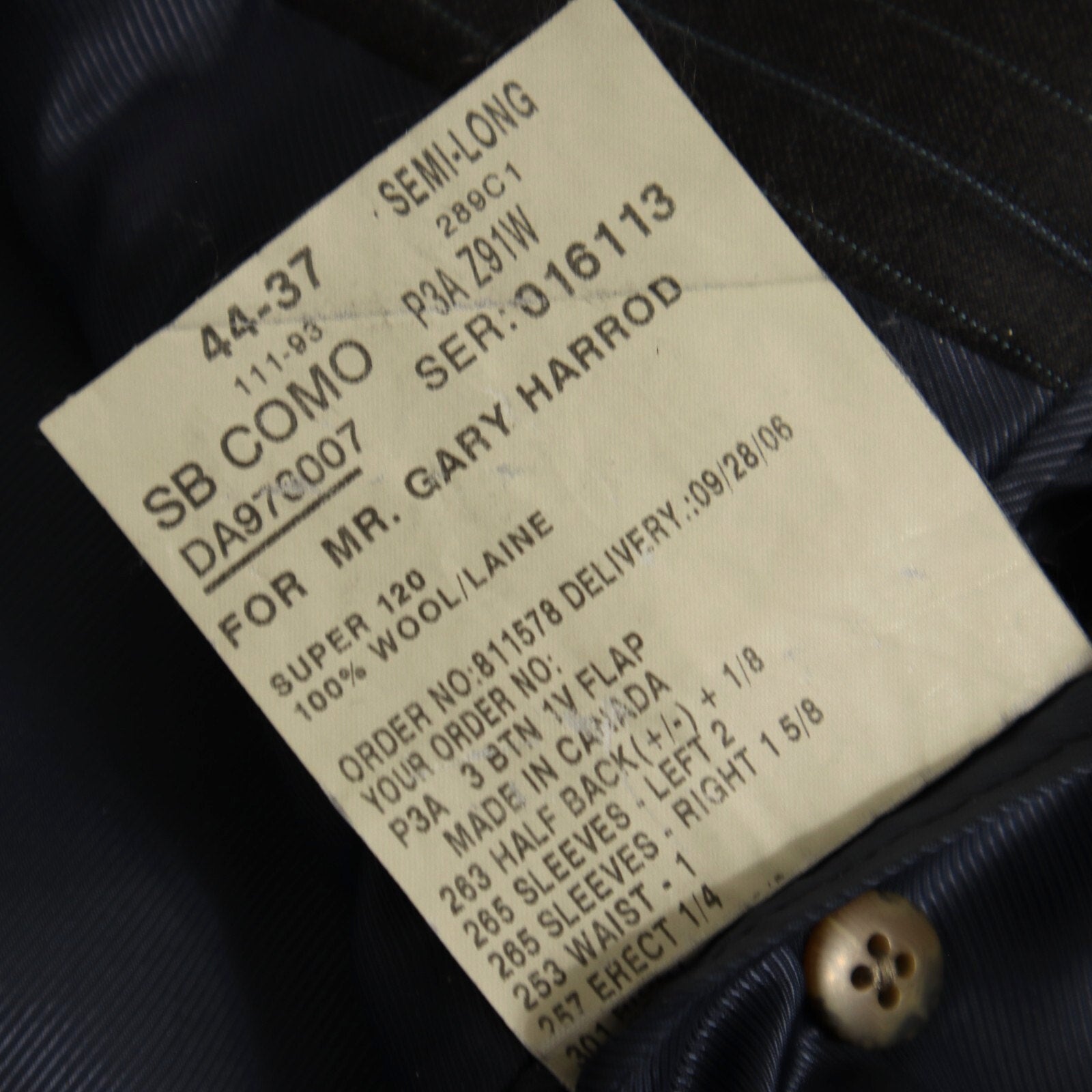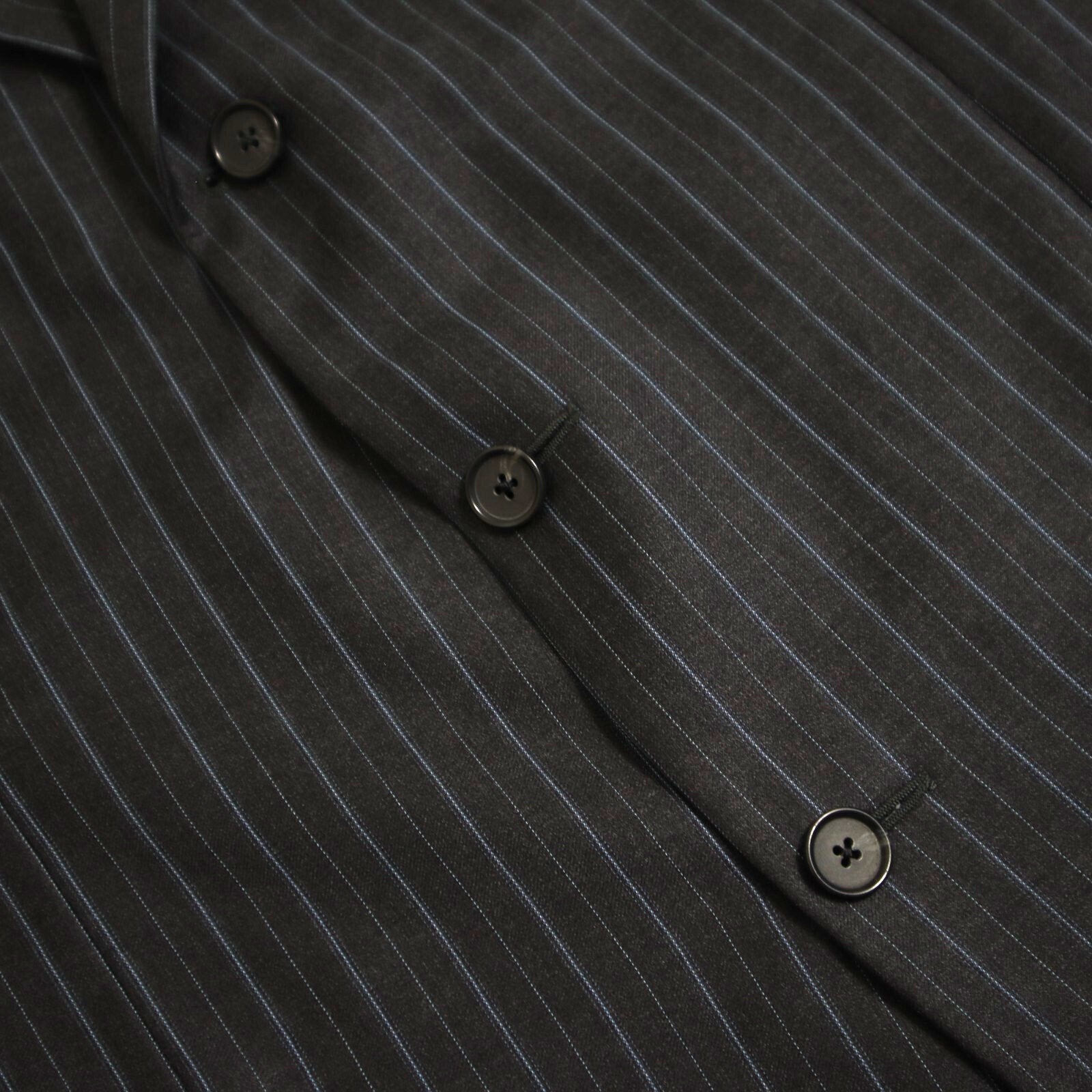 This suit is crafted with a classic 3 button, single-breasted design, featuring a single vented back for a more enhanced fit. The jacket is equipped with flap pockets and 4 cuff buttons on each sleeve. The rich fabric is woven in charcoal gray with blue pinstripe and is composed of 100% super 120's wool, ensuring both luxury and comfort. The interior is fully lined and fully canvased. Because of the nature of pre owned clothes, measurements can change over time. Please note measurements.