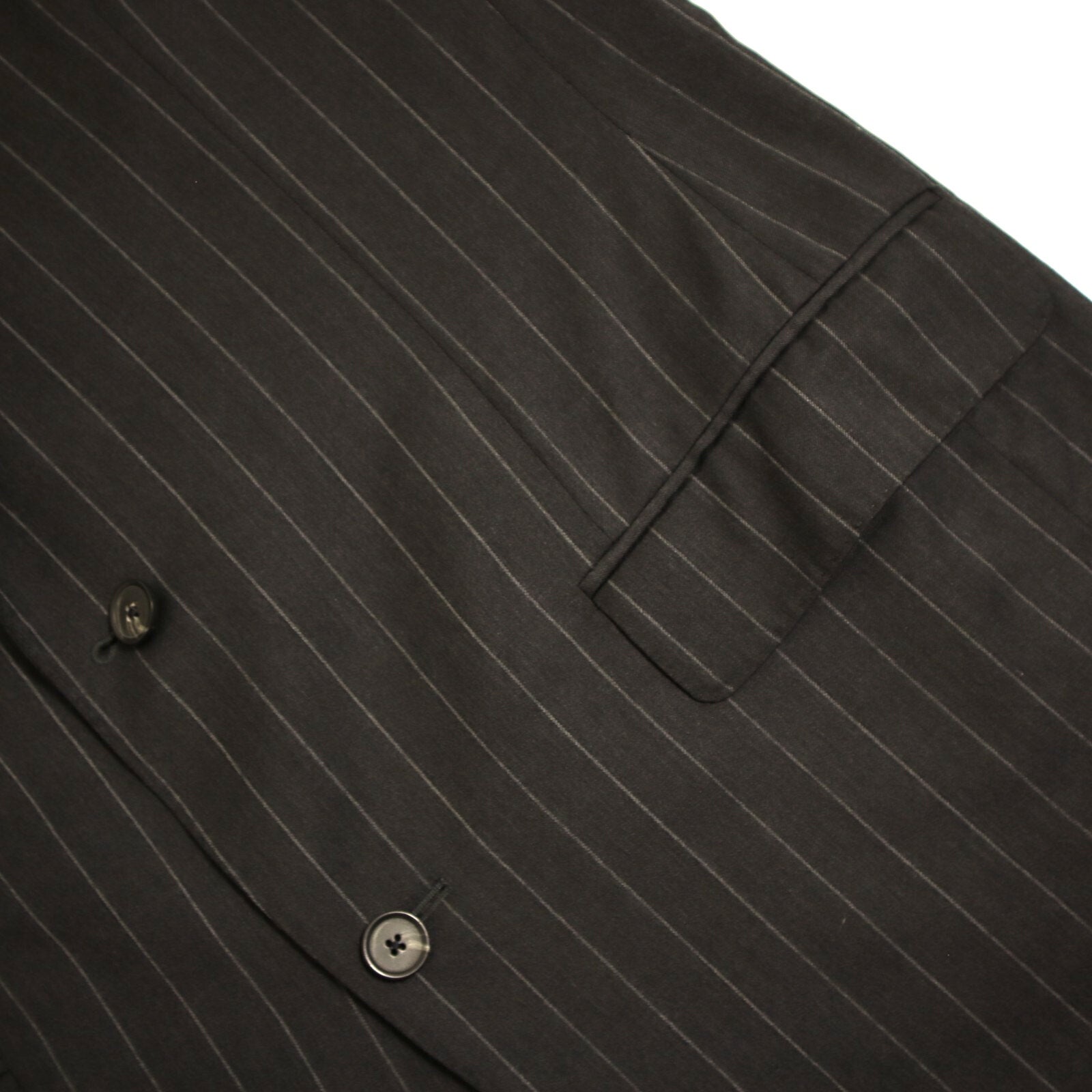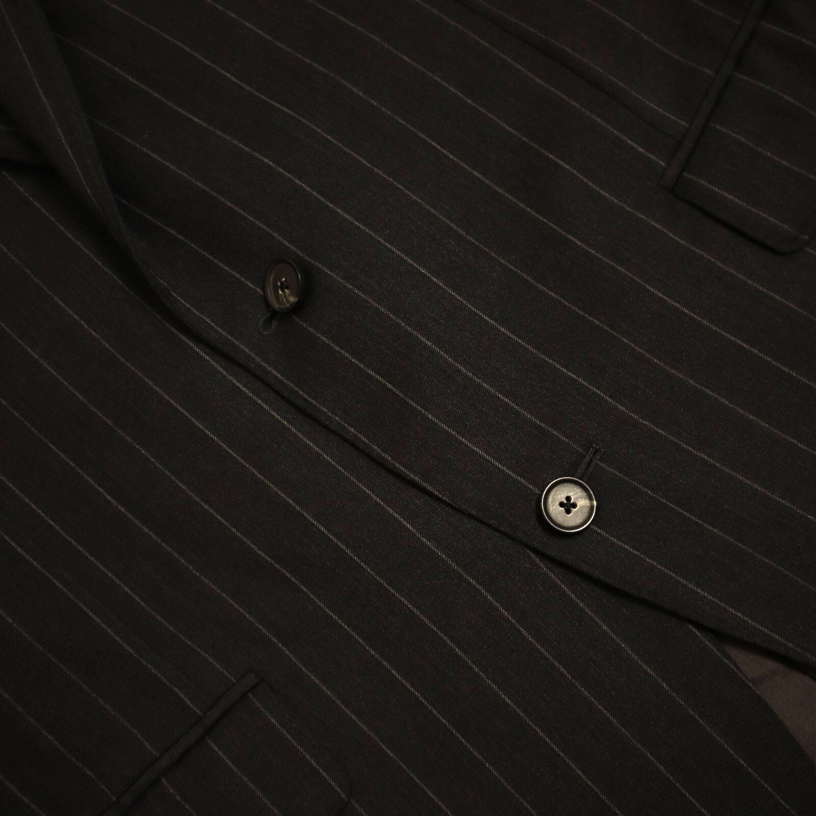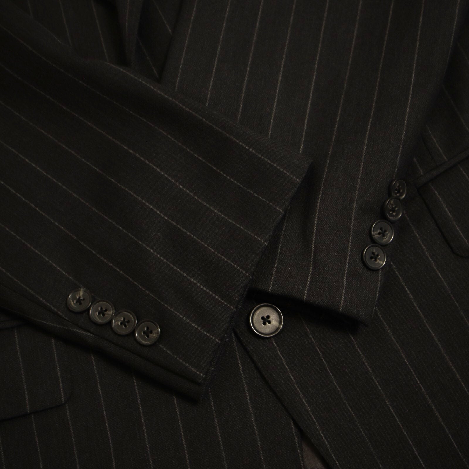 This suit is crafted with a classic 2 button, single-breasted design, featuring a double vented back for a more enhanced fit. The jacket is equipped with flap pockets and 4 cuff buttons on each sleeve. The rich fabric is woven in a beautiful charcoal gray pinstripe and is composed of Loro Piana Extreme super 120's wool, ensuring both luxury and comfort. The interior is fully lined. Tag has been cut out near the collar band and a small amount of stitching has come undone as seen in photo number 6. Because of the nature of pre owned clothes, measurements can change over time. Please note measurements.