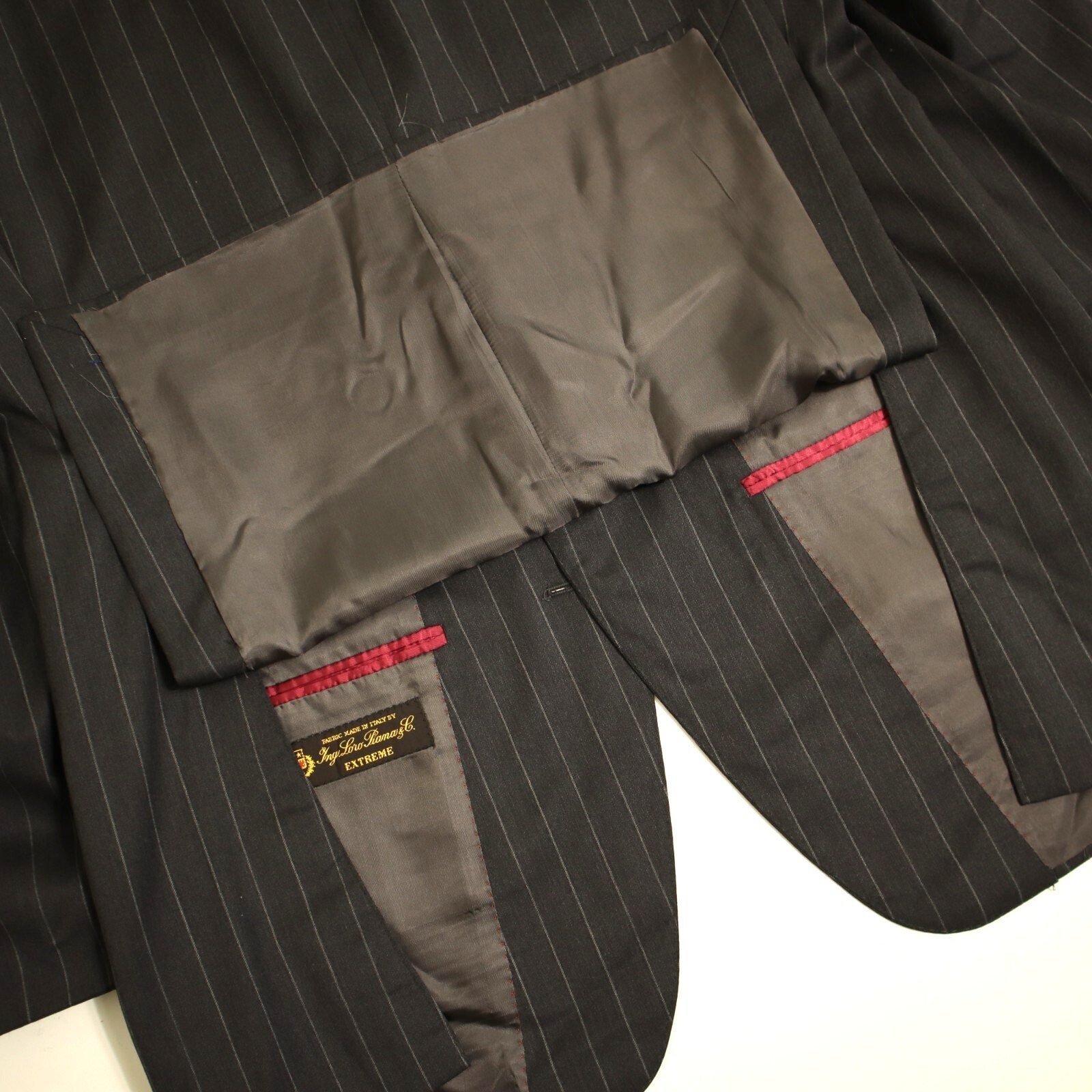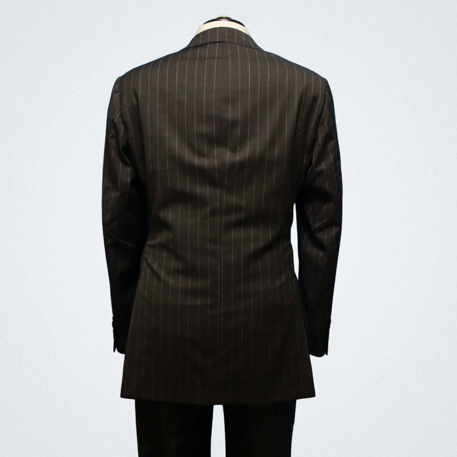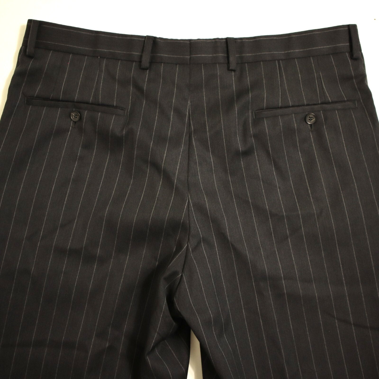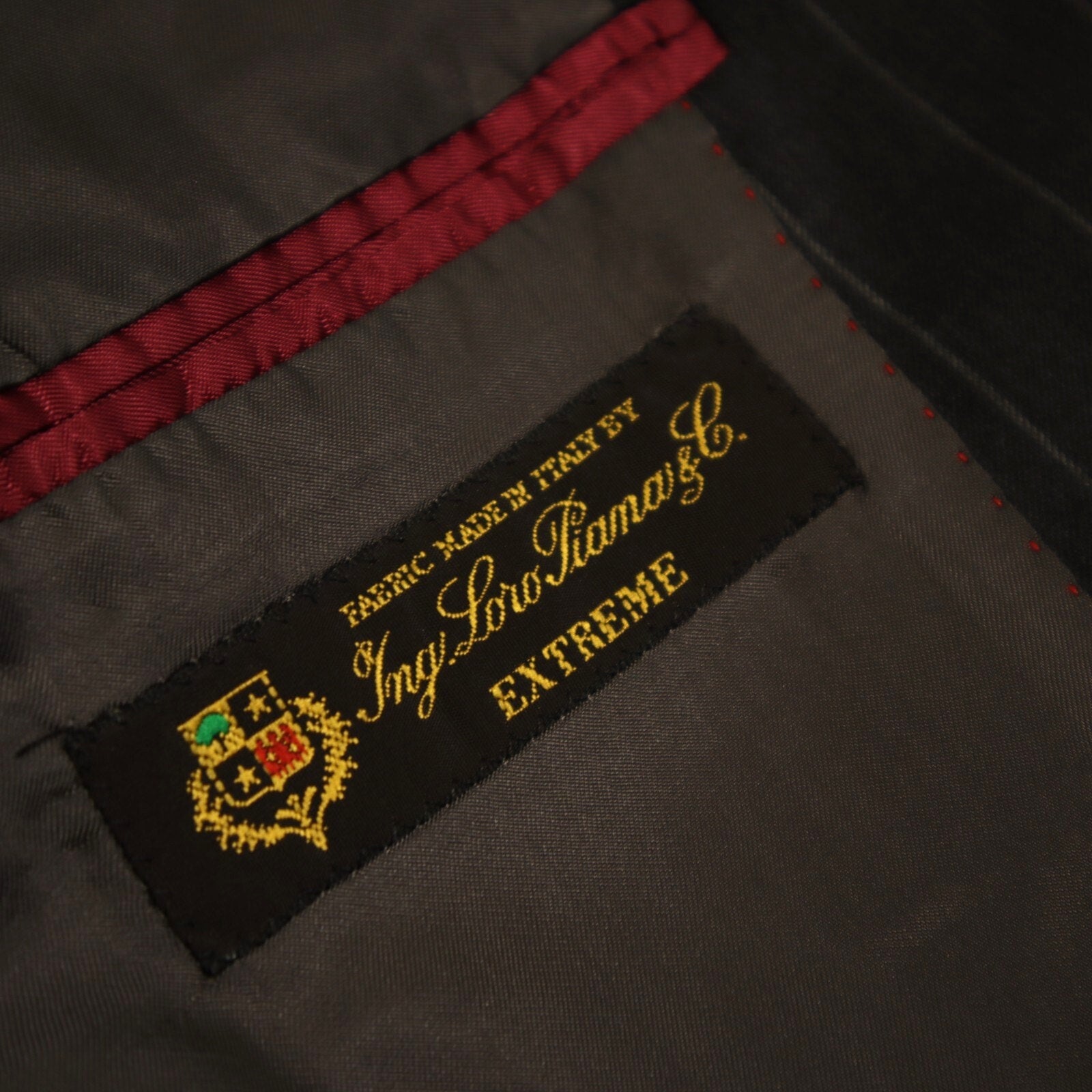 This suit is crafted with a classic 2 button, single-breasted design, featuring a double vented back for a more enhanced fit. The jacket is equipped with flap pockets and 4 cuff buttons on each sleeve. The rich fabric is woven in a beautiful charcoal gray pinstripe and is composed of Loro Piana Extreme super 120's wool, ensuring both luxury and comfort. The interior is fully lined. Tag has been cut out near the collar band and a small amount of stitching has come undone as seen in photo number 6. Because of the nature of pre owned clothes, measurements can change over time. Please note measurements.